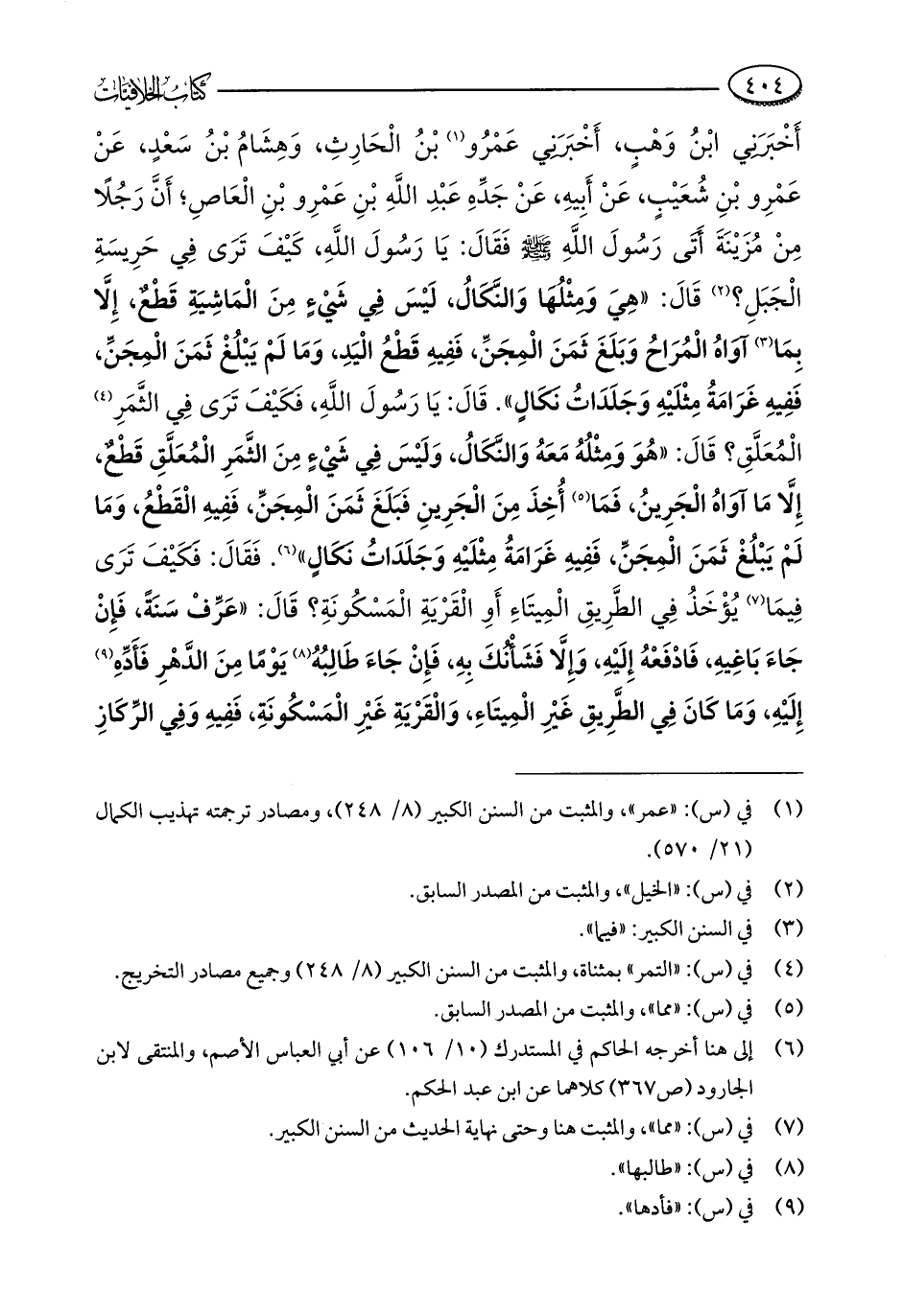 أَخْبَرَنِي ابْنُ وَهْبٍ، أَخْبَرَنِي عَمْرُو (¬1) بْنُ الْحَارِثِ، وَهِشَامُ بْنُ سَعْدٍ، عَنْ عَمْرِو بْنِ شُعَيْبٍ، عَنْ أَبِيهِ، عَنْ جَدِّهِ عَبْدِ اللَّهِ بْنِ عَمْرِو بْنِ الْعَاصِ؛ أَنَّ رَجُلًا مِنْ مُزَيْنَةَ أَتَى رَسُولَ اللَّهِ - صلى الله عليه وسلم - فَقَالَ: يَا رَسُولَ اللَّهِ، كَيْفَ تَرَى فِي حَرِيسَةِ الْجَبَلِ؟ (¬2) قَالَ: "هِيَ وَمِثْلُهَا وَالنَّكَالُ، لَيْسَ فِي شَيْءٍ مِنَ الْمَاشِيَةِ قَطْعٌ، إِلَّا بِمَا (¬3) آوَاهُ الْمُرَاحُ وَبَلَغَ ثَمَنَ الْمِجَنِّ، فَفِيهِ قَطْعُ الْيَدِ، وَمَا لَمْ يَبْلُغْ ثَمَنَ الْمِجَنِّ، فَفِيهِ غَرَامَةُ مِثْلَيْهِ وَجَلَدَاتُ نَكَالٍ". قَالَ: يَا رَسُولَ اللَّهِ، فَكَيْفَ تَرَى فِي الثَّمَرِ (¬4) الْمُعَلَّقِ؟ قَالَ: "هُوَ وَمِثْلُهُ مَعَهُ وَالنَّكَالُ، وَلَيْسَ فِي شَيْءٍ مِنَ الثَّمَرِ الْمُعَلَّقِ قَطْعٌ، إِلَّا مَا آوَاهُ الْجَرِينُ، فَمَا (¬5) أُخِذَ مِنَ الْجَرِينِ فَبَلَغَ ثَمَنَ الْمِجَنِّ، فَفِيهِ الْقَطْعُ، وَمَا لَمْ يَبْلُغْ ثَمَنَ الْمِجَنِّ، فَفِيهِ غَرَامَةُ مِثْلَيْهِ وَجَلَدَاتُ نَكَالٍ" (¬6). فَقَالَ: فكَيْفَ تَرَى فِيمَا (¬7) يُؤْخَذُ فِي الطَّرِيقِ الْمِيتَاءِ أَوِ الْقَرْيَةِ الْمَسْكُونَةِ؟ قَالَ: "عَرِّفْ سَنَةً، فَإِنْ جَاءَ بَاغِيهِ، فَادْفَعْهُ إِلَيْهِ، وَإِلَّا فَشَأْنُكَ بِهِ، فَإِنْ جَاءَ طَالِبُهُ (¬8) يَوْمًا مِنَ الدَّهْرِ فَأَدِّهِ (¬9) إِلَيْهِ، وَمَا كَانَ فِي الطَّرِيقِ غَيْرِ الْمِيتَاءِ، وَالْقَرْيَةِ غَيْرِ الْمَسْكُونَةِ، فَفِيهِ وَفِي الرِّكَازِ