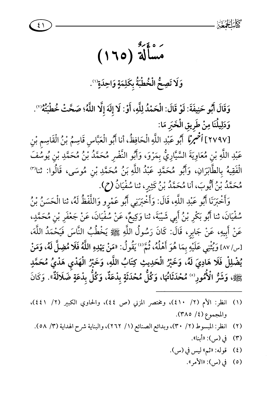 وَأَخْبَرَنَا أَبو عَبْدِ اللَّهِ، قَالَ: وَأَخْبَرَنِي أَبُو عَمْرٍو وَاللَّفْظُ لَهُ، ثنا الْحَسَنُ بْنُ سُفْيَانَ، ثنا أَبو بَكْرِ بْنُ أَبِي شَيْبَةَ، ثنا وَكِيعٌ، عَنْ سُفْيَانَ، عَنْ جَعْفَرِ بْنِ مُحَمَّدٍ، عَنْ أَبِيهِ، عَنْ جَابِرٍ، قَالَ: كَانَ رَسُولُ اللَّهِ - صلى الله عليه وسلم - يَخْطُبُ النَّاسَ فَيَحْمَدُ اللَّهَ، وَيُثْنِي عَلَيْهِ بِمَا هُوَ أَهْلُهُ، ثُمَّ (¬4) يَقُولُ: "مَنْ يَهْدِهِ اللَّهُ فَلَا مُضِلَّ لَهُ، وَمَنْ يُضْلِلْ فَلَا هَادِيَ لَهُ، وَخَيْرُ الْحَدِيثِ كِتَابُ اللَّهِ، وَخَيْرُ الْهَدْيِ هَدْيُ مُحَمَّدٍ - صلى الله عليه وسلم -، وَشَرُّ الْأُمُورِ (¬5) مُحْدَثَاتُهَا، وَكُلُّ مُحْدَثَةٍ بِدْعَةٌ، وَكُلُّ بِدْعَةٍ ضَلَالَةٌ". وَكَانَ