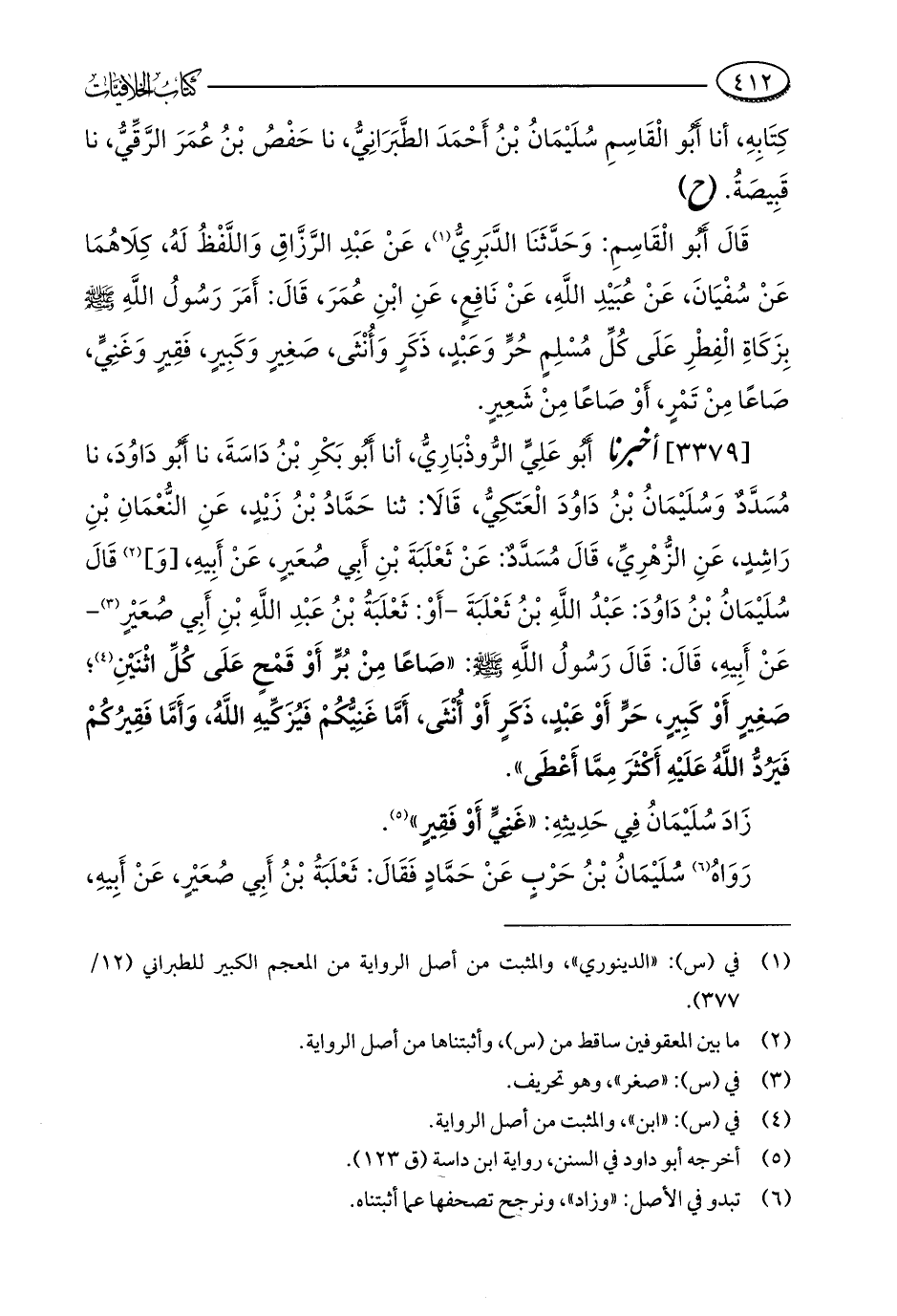 [3379] أخبرنا أَبُو عَلِيٍّ الرُّوذْبَارِيُّ، أنا أَبُو بَكْرِ بْنُ دَاسَةَ، نا أَبُو دَاوُدَ، نا مُسَدَّدٌ وَسلَيْمَانُ بْنُ دَاوُدَ الْعَتَكِيُّ، قَالَا: ثنا حَمَّادُ بْنُ زَيْدٍ، عَنِ النُّعْمَانِ بْنِ رَاشِدٍ، عَنِ الزُّهْرِيِّ، قَالَ مُسَدَّدٌ: عَنْ ثَعْلَبَةَ بْنِ أَبِي صُعَيرٍ، عَنْ أَبِيهِ، [وَ] (¬2) قَالَ سُلَيْمَانُ بْنُ دَاوُدَ: عَبْدُ اللَّهِ بْنُ ثَعْلَبَةَ - أَوْ: ثَعْلَبَةُ بْنُ عَبْدِ اللَّهِ بْنِ أَبِي صُعَيْرٍ (¬3) - عَنْ أَبِيهِ، قَالَ: قَالَ رَسُولُ اللَّهِ - صلى الله عليه وسلم -: "صَاعًا مِنْ بُرٍّ أَوْ قَمْحٍ عَلَى كُلِّ اثْنَيْنِ (¬4)؛ صَغِيرٍ أَوْ كَبِيرٍ، حَرٍّ أَوْ عَبْدٍ، ذَكَرٍ أَوْ أُنْثَى، أَمَّا غَنِيُّكُمْ فَيُزَكِّيهِ اللَّهُ، وَأَمَّا فَقِيرُكُمْ فَيَرُدُّ اللَّهُ عَلَيْهِ أَكْثَرَ مِمَّا أَعْطَى".