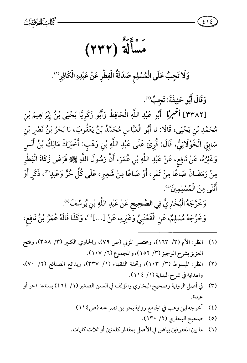 مَسْأَلَةٌ (232): وَلَا تَجِبُ عَلَى الْمُسْلِمِ صَدَقَةُ الْفِطْرِ عَنْ عَبْدِهِ الْكَافِرِ (¬1).