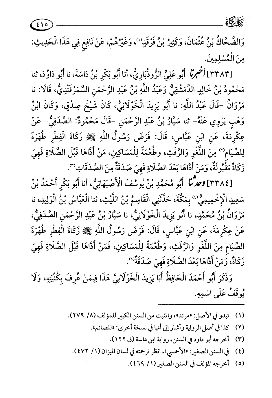 [3383] أخبرنا أَبُو عَلِيٍّ الرُّوذْبَارِيُّ، أنا أَبُو بَكْرِ بْنُ دَاسَةَ، نا أَبُو دَاوُدَ، ثنا مَحْمُودُ بْنُ خَالِدٍ الدِّمَشْقِيُّ وَعَبْدُ اللَّهِ بْنُ عَبْدِ الرَّحْمَنِ السَّمَرْقَنْدِيُّ، قَالَا: نا مَرْوَانُ - قَالَ عَبْدُ اللَّهِ: نا أَبُو يَزِيدَ الْخَوْلَانِيُّ، كَانَ شَيْخَ صِدْقٍ، وَكَانَ ابْنُ وَهْبٍ يَرْوِي عَنْهُ - ثنا سَيَّارُ بْنُ عَبْدِ الرَّحْمَنِ - قَالَ مَحْمُودٌ: الصَّدَفِيُّ - عَنْ عِكْرِمَةَ، عَنِ ابْنِ عَبَّاسٍ، قَالَ: فَرَضَ رَسُولُ اللَّهِ - صلى الله عليه وسلم - زَكَاةَ الْفِطْرِ طُهْرَةً لِلصِّيَامِ (¬2) مِنَ اللَّغْوِ وَالرَّفَثِ، وطُعْمَةً لِلْمَسَاكِينِ، مَنْ أَدَّاهَا قَبْلَ الصَّلَاةِ فَهِيَ زَكَاةٌ مَقْبُولَةٌ، وَمَنْ أَدَّاهَا بَعْدَ الصَّلَاةِ فَهِيَ صَدَقَةٌ مِنَ الصَّدَقَاتِ (¬3).