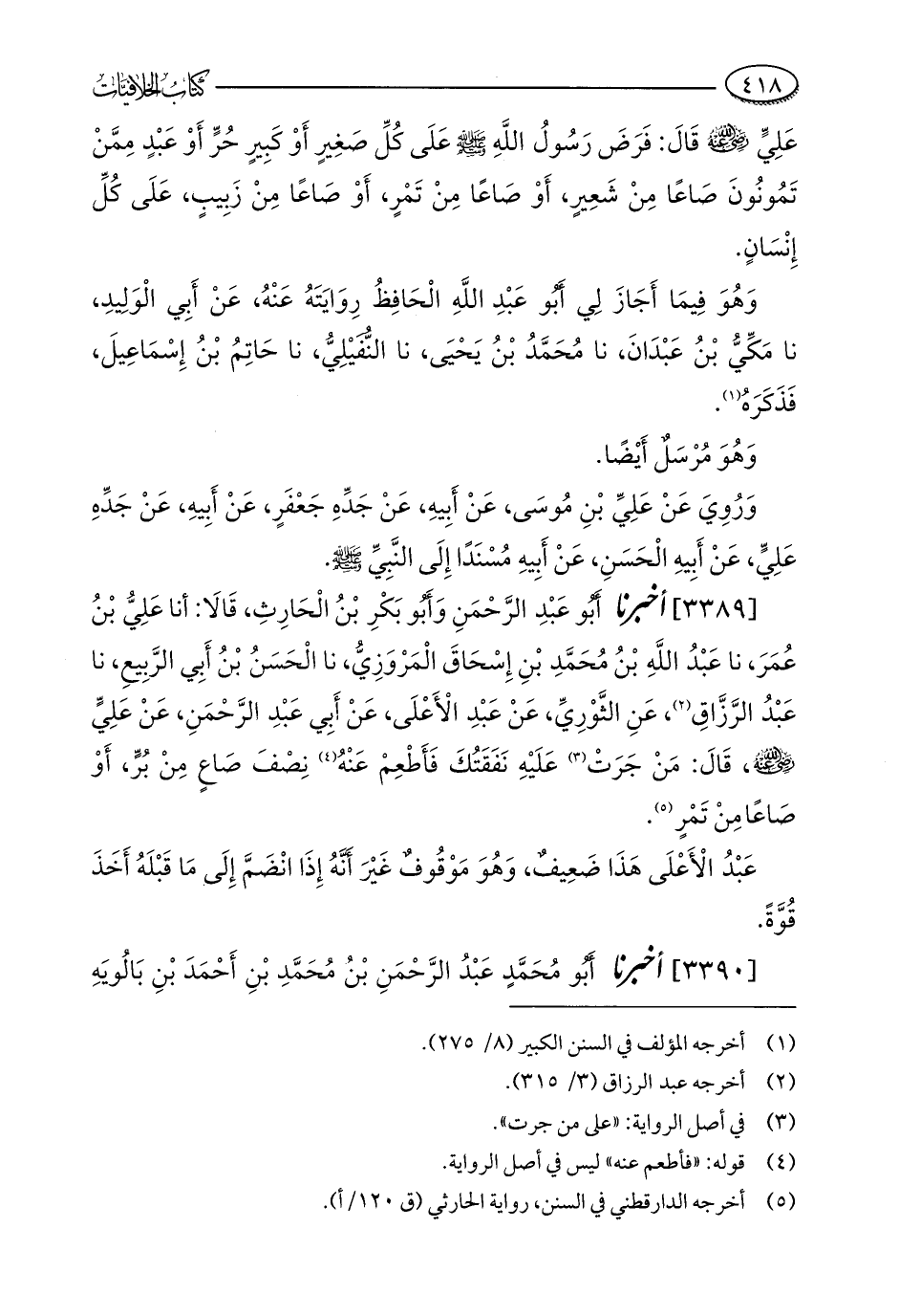 [3389] أخبرنا أَبُو عَبْدِ الرَّحْمَنِ وَأَبُو بَكْرِ بْنُ الْحَارِثِ، قَالَا: أنا عَلِيُّ بْنُ عُمَرَ، نا عَبْدُ اللَّهِ بْنُ مُحَمَّدِ بْنِ إِسْحَاقَ الْمَرْوَزِيُّ، نا الْحَسَنُ بْنُ أَبِي الرَّبِيعِ، نا عَبْدُ الرَّزَّاقِ (¬2)، عَنِ الثَّوْرِيِّ، عَنْ عَبْدِ الْأَعْلَى، عَنْ أَبِي عَبْدِ الرَّحْمَنِ، عَنْ عَلِيٍّ - رضي الله عنه -، قَالَ: مَنْ جَرَتْ (¬3) عَلَيْهِ نَفَقَتُكَ فَأَطْعِمْ عَنْهُ (¬4) نِصْفَ صَاعٍ مِنْ بُرٍّ، أَوْ صَاعًا مِنْ تَمْرٍ (¬5).