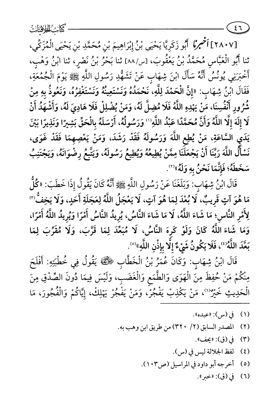 [2807] أخبرنا أَبُو زَكَرِيَّا يَحْيَى بْنُ إِبْرَاهِيمَ بْنِ مُحَمَّدِ بْنِ يَحْيَى الْمُزَكِّي، ثنا أَبُو الْعَبَّاسِ مُحَمَّدُ بْنُ يَعْقُوبَ، ثنا بَحْرُ بْنُ نَصْرٍ، ثنا ابْنُ وَهْبٍ، أَخْبَرَنِي يُونُسُ أَنَّهُ سَأَلَ ابْنَ شِهَابٍ عَنْ تَشَهُّدِ رَسُولِ اللَّهِ - صلى الله عليه وسلم - يَوْمَ الْجُمُعَةِ، فَقَالَ ابْنُ شِهَابٍ: "إِنَّ الْحَمْدَ لِلَّهِ, نَحْمَدُهُ وَنَسْتَعِينُهُ وَنَسْتَغْفِرُهُ، وَنَعُوذُ بِهِ مِنْ شُرُورِ أَنْفُسِنَا، مَنْ يَهْدِهِ اللَّهُ فَلَا مُضِلَّ لَهُ، وَمَنْ يُضْلِلْ فَلَا هَادِيَ لَهُ، وَأَشْهَدُ أَنْ لَا إِلَهَ إِلَّا اللَّهُ وَأَنَّ مُحَمَّدًا عَبْدُ اللَّهِ (¬1) وَرَسُولُهُ، أَرْسَلَهُ بِالْحَقِّ بَشِيرًا وَنَذِيرًا بَيْنَ يَدَي السَّاعَةِ، مَنْ يُطِعِ اللَّهَ وَرَسُولَهُ فَقَدْ رَشَدَ، وَمَنْ يَعْصِهِمَا فَقَدْ غَوَى، نَسْأَلُ اللَّهَ رَبَّنَا أَنْ يَجْعَلَنَا مِمَّنْ يُطِيعُهُ وَيُطِيعُ رَسُولَهُ، وَيَتَّبِعُ رِضْوَانَهُ، وَيَجْتَنِبُ سَخَطَهُ؛ فَإِنَّمَا نَحْنُ بِهِ وَلَهُ" (¬2).