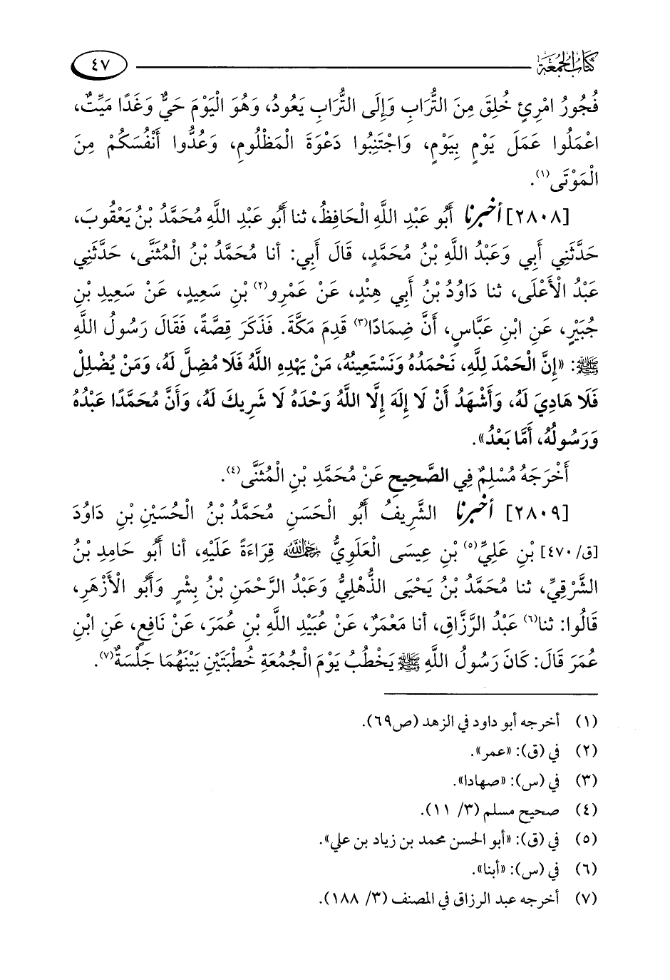 [2808] أخبرنا أَبُو عَبْدِ اللَّهِ الْحَافِظُ، ثنا أَبُو عَبْدِ اللَّهِ مُحَمَّدُ بْنُ يَعْقُوبَ، حَدَّثَنِي أَبِي وَعَبْدُ اللَّهِ بْنُ مُحَمَّدٍ، قَالَ أَبِي: أنا مُحَمَّدُ بْنُ الْمُثَنَّى، حَدَّثَنِي عَبْدُ الْأَعْلَى، ثنا دَاوُدُ بْنُ أَبِي هِنْدٍ، عَنْ عَمْرِو (¬2) بْنِ سَعِيدٍ، عَنْ سَعِيدِ بْنِ جُبَيْرٍ، عَنِ ابْنِ عَبَّاسٍ، أَنَّ ضِمَادًا (¬3) قَدِمَ مَكَّةَ. فَذَكَرَ قِصَّةً، فَقَالَ رَسُولُ اللَّهِ - صلى الله عليه وسلم -: "إِنَّ الْحَمْدَ لِلَّهِ، نَحْمَدُهُ وَنَسْتَعِينُهُ، مَنْ يَهْدِهِ اللَّهُ فَلَا مُضِلَّ لَهُ، وَمَنْ يُضْلِلْ فَلَا هَادِيَ لَهُ، وَأَشْهَدُ أَنْ لَا إِلَهَ إِلَّا اللَّهُ وَحْدَهُ لَا شَرِيكَ لَهُ، وَأَنَّ مُحَمَّدًا عَبْدُهُ وَرَسُولُهُ، أَمَّا بَعْدُ".