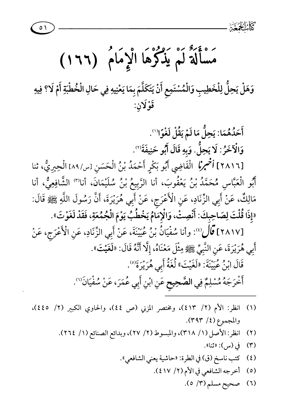 مَسْأَلَةٌ لَمْ يَذْكُرْهَا الْإِمَامُ (166): وَهَلْ يَحِلُّ لِلْخَطِيبِ وَالْمُسْتَمِعِ أَنْ يَتكَلَّمَ بِمَا يَعْنِيهِ فِي حَالِ الْخُطْبَةِ أَمْ لَا؟ فِيهِ قَوْلَانِ: