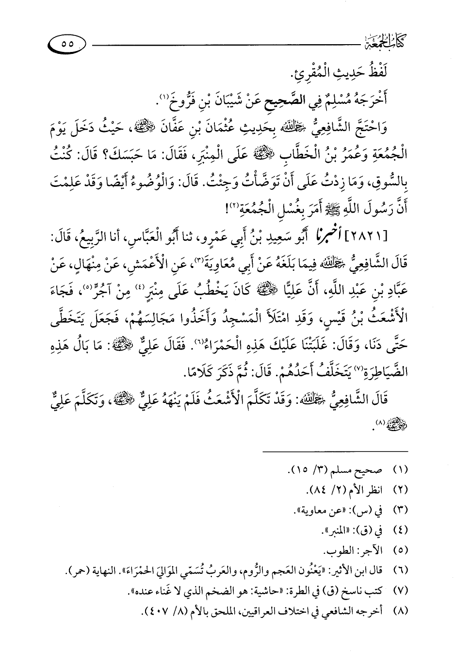 [2821] أخبرنا أَبُو سَعِيدِ بْنُ أَبِي عَمْرٍو، ثنا أَبُو الْعَبَّاسِ، أنا الرَّبِيعُ، قَالَ: قَالَ الشَّافِعِيُّ - رحمه الله - فِيمَا بَلَغَهُ عَنْ أَبِي مُعَاوِيَةَ (¬3)، عَنِ الْأَعْمَشِ، عَنْ مِنْهَالٍ، عَنْ عَبَّادِ بْنِ عَبْدِ اللَّهِ، أَنَّ عَلِيًّا - رضي الله عنه - كَانَ يَخْطُبُ عَلَى مِنْبَرٍ (¬4) مِنْ آجُرٍّ (¬5)، فَجَاءَ الْأَشْعَثُ بْنُ قَيْسٍ، وَقَدِ امْتَلَأَ الْمَسْجِدُ وَأَخَذُوا مَجَالِسَهُمْ، فَجَعَلَ يَتَخَطَّى حَتَّى دَنَا، وَقَالَ: غَلَبَتْنَا عَلَيْكَ هَذِهِ الْحَمْرَاءُ (¬6). فَقَالَ عَلِيٌّ - رضي الله عنه -: مَا بَالُ هَذِهِ الضَّيَاطِرَةِ (¬7) يَتَخَلَّفُ أَحَدُهُمْ. قَالَ: ثُمَّ ذَكَرَ كَلَامًا.