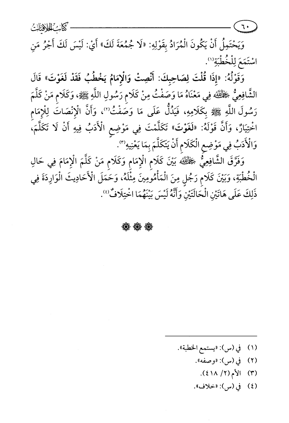 وَفَرَّقَ الشَّافِعِيُّ - رحمه الله - بَيْنَ كَلَامِ الْإِمَامِ وَكَلَامِ مَن كَلَّمَ الْإِمَامَ فِي حَالِ الْخُطْبَةِ، وَبَيْنَ كَلَامِ رَجُلٍ مِنَ الْمَأْمُومِينَ مِثْلَهُ، وَحَمَلَ الْأَحَادِيثَ الْوَارِدَةَ فِي ذَلِكَ عَلَى هَاتَيْنِ الْحَالَتَيْنِ وَأَنَّهُ لَيْسَ بَيْنَهُمَا اخْتِلَافٌ (¬4).