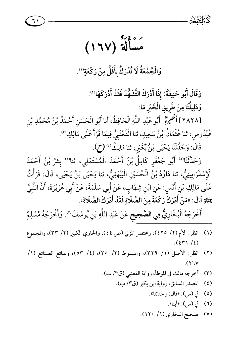 مَسْأَلَةٌ (167): وَالْجُمُعَةُ لَا تُدْرَكُ بِأَقَلَّ مِنْ رَكْعَةٍ (¬1).