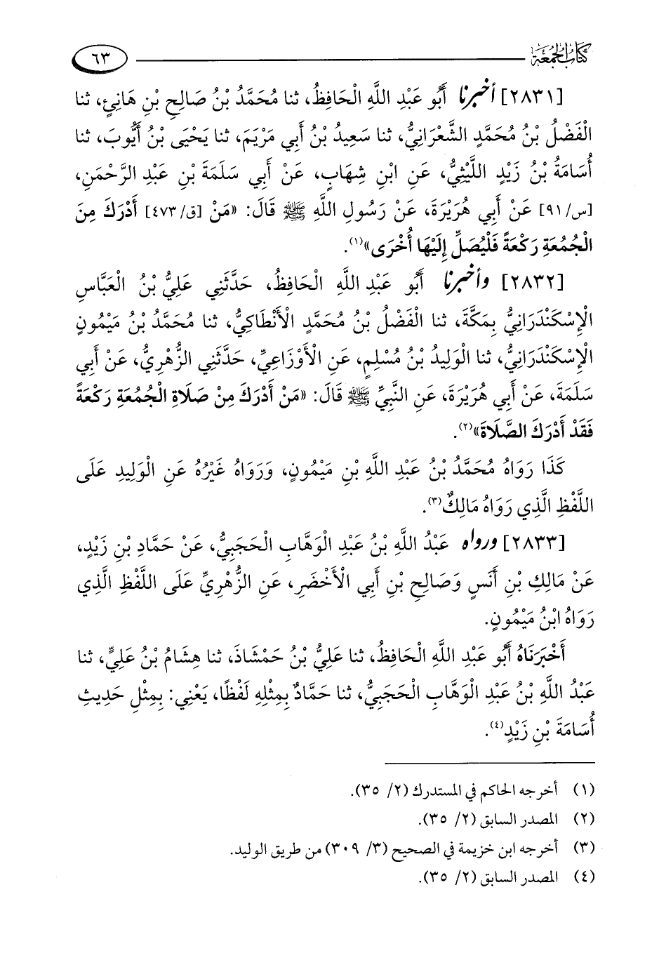 [2831] أخبرنا أَبُو عَبْدِ اللَّهِ الْحَافِظُ، ثنا مُحَمَّدُ بْنُ صَالِحِ بْنِ هَانِئٍ، ثنا الْفَضْلُ بْنُ مُحَمَّدٍ الشَّعْرَانِيُّ، ثنا سَعِيدُ بْنُ أَبِي مَرْيَمَ، ثنا يَحْيَى بْنُ أَيُّوبَ، ثنا أُسَامَةُ بْنُ زَيْدٍ اللَّيْثِيُّ، عَنِ ابْنِ شِهَابٍ، عَنْ أَبِي سلَمَةَ بْنِ عَبْدِ الرَّحْمَنِ، عَنْ أَبِي هُرَيْرَةَ، عَنْ رَسُولِ اللَّهِ - صلى الله عليه وسلم - قَالَ: "مَنْ أَدْرَكَ مِنَ الْجُمُعَةِ رَكْعَةً فَلْيُصَلِّ إِلَيْهَا أُخْرَى" (¬1).