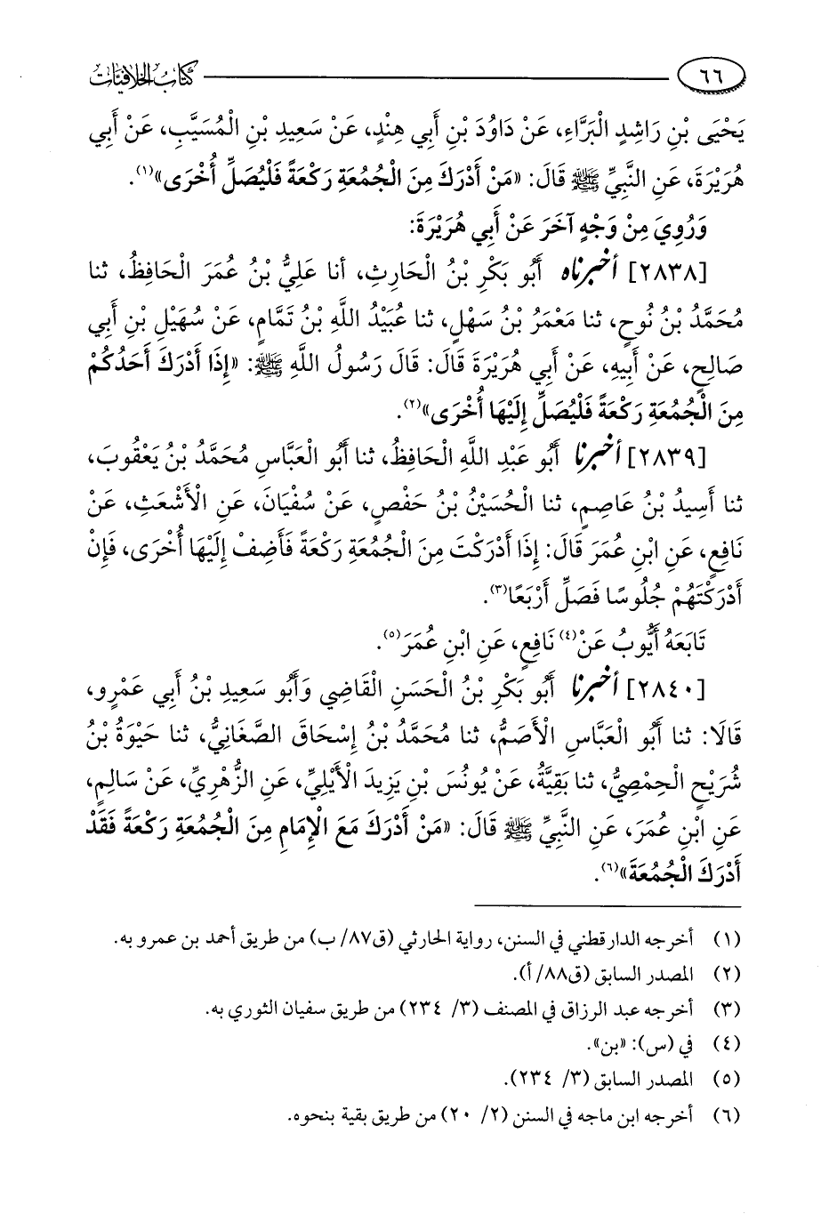 [2838] أخبرناه أَبُو بَكْرِ بْنُ الْحَارِثِ، أنا عَلِيُّ بْنُ عُمَرَ الْحَافِظُ، ثنا مُحَمَّدُ بْنُ نُوحٍ، ثنا مَعْمَرُ بْنُ سَهْلٍ، ثنا عُبَيْدُ اللَّهِ بْنُ تَمَّامٍ، عَنْ سُهَيْلِ بْنِ أَبِي صَالِحٍ، عَنْ أَبِيهِ، عَنْ أَبِي هُرَيْرَةَ قَالَ: قَالَ رَسُولُ اللَّهِ - صلى الله عليه وسلم -: "إِذَا أَدْرَكَ أَحَدُكُمْ مِنَ الْجُمُعَةِ رَكْعَةً فَلْيُصَلِّ إِلَيْهَا أُخْرَى" (¬2).