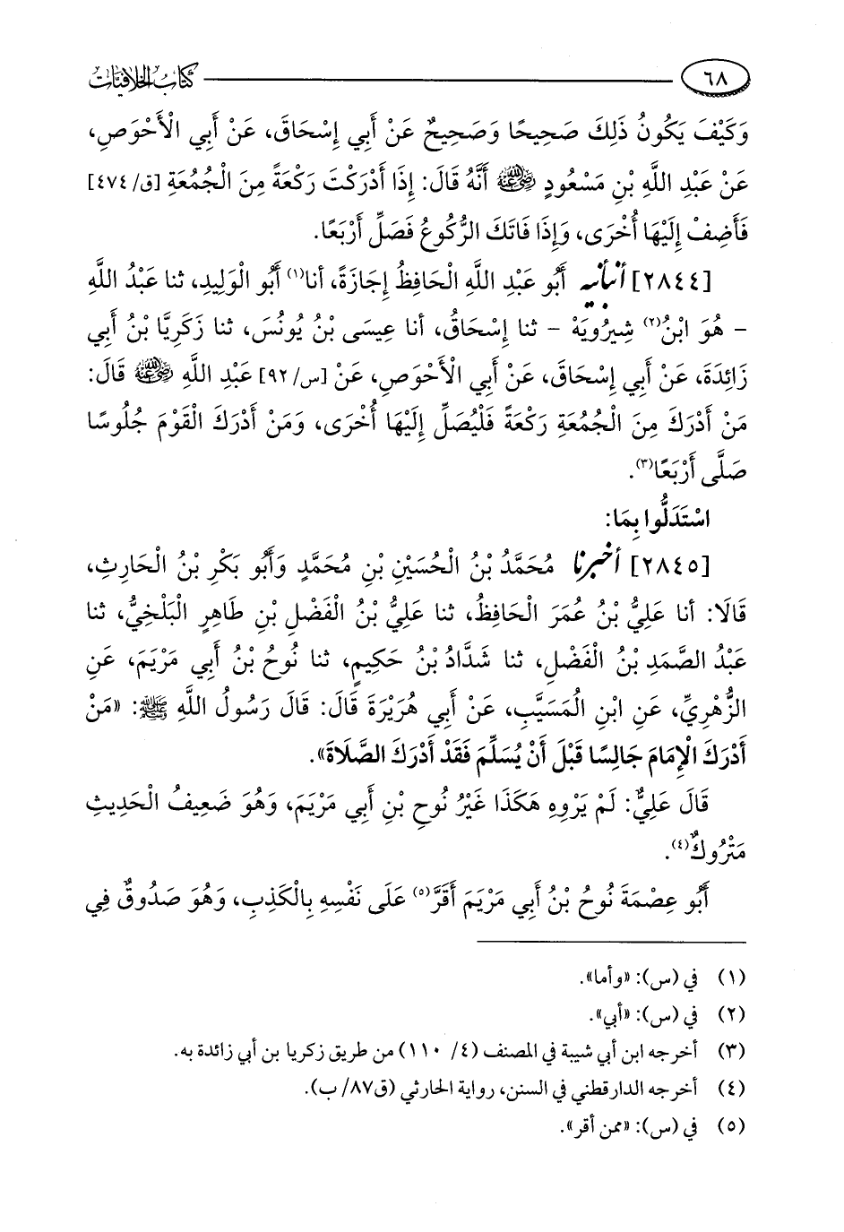 [2844] أنبأنيه أَبُو عَبْدِ اللَّهِ الْحَافِظُ إِجَازَةً، أنا (¬1) أَبُو الْوَلِيدِ، ثنا عَبْدُ اللَّهِ - هُوَ ابْنُ (¬2) شِيرُويَهْ - ثنا إِسْحَاقُ، أنا عِيسَى بْنُ يُونُسَ، ثنا زَكَرِيَّا بْنُ أَبِي زَائِدَةَ، عَنْ أَبِي إِسْحَاقَ، عَنْ أَبِي الْأَحْوَصِ، عَنْ عَبْدِ اللَّهِ - رضي الله عنه - قَالَ: مَنْ أَدْرَكَ مِنَ الْجُمُعَةِ رَكْعَةً فَلْيُصَلِّ إِلَيْهَا أُخْرَى، وَمَنْ أَدْرَكَ الْقَوْمَ جُلُوسًا صَلَّى أَرْبَعًا (¬3).