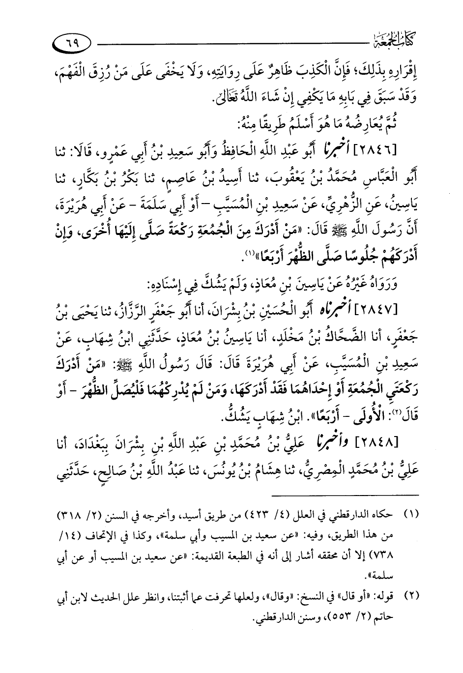 [2846] أخبرنا أَبُو عَبْدِ اللَّهِ الْحَافِظُ وَأَبُو سَعِيدِ بْنُ أَبِي عَمْرٍو، قَالَا: ثنا أَبُو الْعَبَّاسِ مُحَمَّدُ بْنُ يَعْقُوبَ، ثنا أَسِيدُ بْنُ عَاصِمٍ، ثنا بَكْرُ بْنُ بَكَّارٍ، ثنا يَاسِينُ، عَنِ الزُّهْرِيِّ، عَنْ سَعِيدِ بْنِ الْمُسَيَّبِ - أَوْ أَبِي سَلَمَةَ - عَنْ أَبِي هُرَيْرَةَ، أَنَّ رَسُولَ اللَّهِ - صلى الله عليه وسلم - قَالَ: "مَنْ أَدْرَكَ مِنَ الْجُمُعَةِ رَكْعَةً صَلَّى إِلَيْهَا أُخْرَى، وَإِنْ أَدْرَكَهُمْ جُلُوسًا صَلَّى الظُّهْرَ أَرْبَعًا" (¬1).