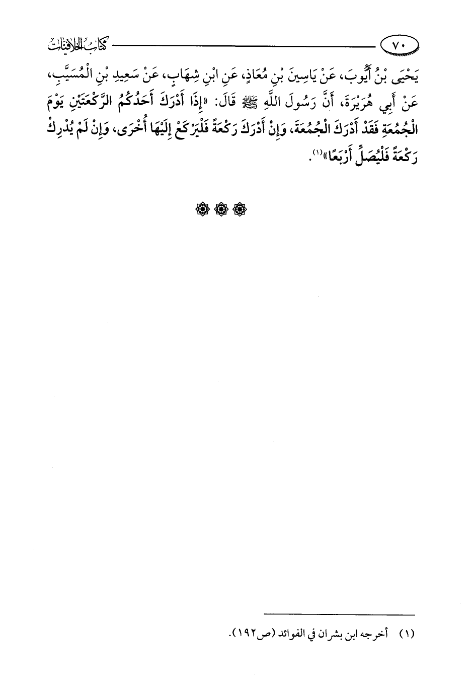 يَحْيَى بْنُ أَيُّوبَ، عَنْ يَاسِينَ بْنِ مُعَاذٍ، عَنِ ابْنِ شِهَابٍ، عَنْ سَعِيدِ بْنِ الْمُسَيَّبِ، عَنْ أَبِي هُرَيْرَةَ، أَنَّ رَسُولَ اللَّهِ - صلى الله عليه وسلم - قَالَ: "إِذَا أَدْرَكَ أَحَدُكُمُ الرَّكْعَتَيْنِ يَوْمَ الْجُمُعَةِ فَقَدْ أَدْرَكَ الْجُمُعَةَ، وَإِنْ أَدْرَكَ رَكْعَةً فَلْيَرْكَعْ إِلَيْهَا أُخْرَى، وَإِنْ لَمْ يُدْرِكْ رَكْعَةً فَلْيُصَلِّ أَرْبَعًا" (¬1).