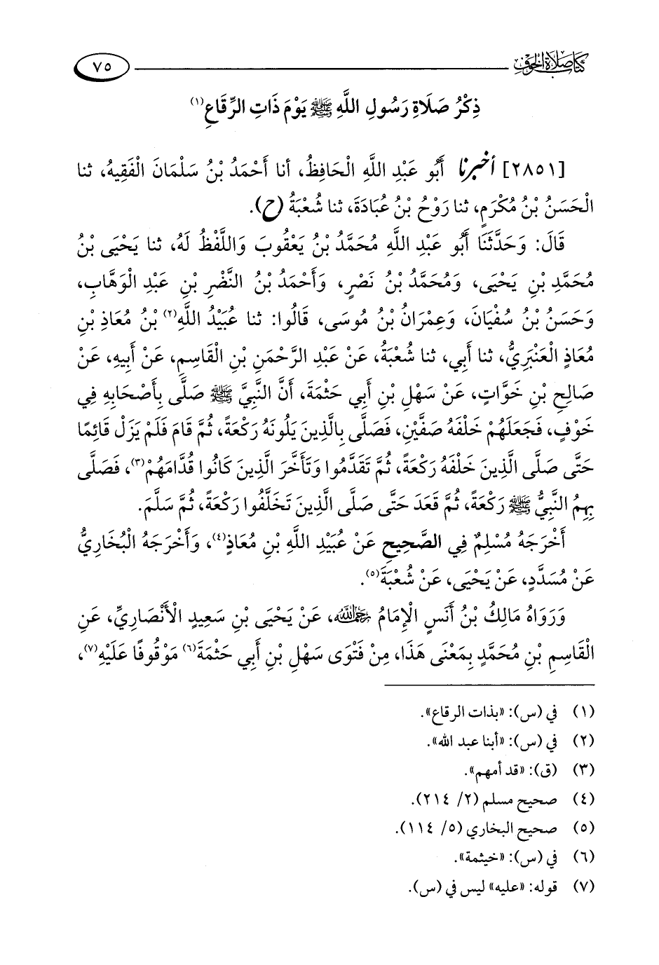 قَالَ: وَحَدَّثَنَا أَبُو عَبْدِ اللَّهِ مُحَمَّدُ بْنُ يَعْقُوبَ وَاللَّفْظُ لَهُ، ثنا يَحْيَى بْنُ مُحَمَّدِ بْنِ يَحْيَى، وَمُحَمَّدُ بْنُ نَصْرٍ، وَأَحْمَدُ بْنُ النَّضْرِ بْنِ عَبْدِ الْوَهَّابِ، وَحَسَنُ بْنُ سُفْيَانَ، وَعِمْرَانُ بْنُ مُوسَى، قَالُوا: ثنا عُبَيْدُ اللَّهِ (¬2) بْنُ مُعَاذِ بْنِ مُعَاذٍ الْعَنْبَرِيُّ، ثنا أَبِي، ثنا شُعْبَةُ، عَنْ عَبْدِ الرَّحْمَنِ بْنِ الْقَاسِمِ، عَنْ أَبِيهِ، عَنْ صَالِحِ بْنِ خَوَّاتٍ، عَنْ سَهْلِ بْنِ أَبِي حَثْمَةَ، أَنَّ النَّبِيَّ - صلى الله عليه وسلم - صَلَّى بِأَصْحَابِهِ فِي خَوْفٍ، فَجَعَلَهُمْ خَلْفَهُ صَفَّيْنِ، فَصَلَّى بِالَّذِينَ يَلُونَهُ رَكْعَةً، ثُمَّ قَامَ فَلَمْ يَزَلْ قَائِمًا حَتَّى صَلَّى الَّذِينَ خَلْفَهُ رَكْعَةً، ثُمَّ تَقَدَّمُوا وَتَأَخَرَ الَّذِينَ كَانُوا قُدَّامَهُمْ (¬3)، فَصَلَّى بِهِمُ النَّبِيُّ - صلى الله عليه وسلم - ركْعَةً، ثُمَّ قَعَدَ حَتَّى صَلَّى الَّذِينَ تَخَلَّفُوا رَكْعَةً، ثُمَّ سَلَّمَ.