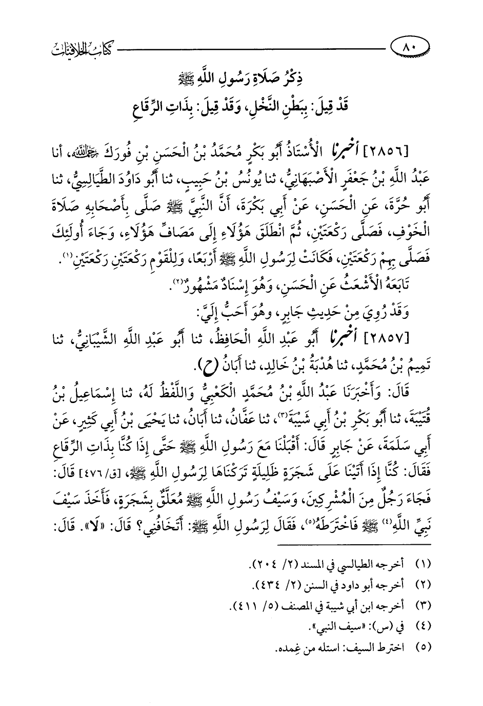 قَالَ: وَأَخْبَرَنَا عَبْدُ اللَّهِ بْنُ مُحَمَّدٍ الْكَعْبِيُّ وَاللَّفْظُ لَهُ، ثنا إِسمَاعِيلُ بْنُ قُتَيْبَةَ، ثنا أَبُو بَكْرِ بْنُ أَبِي شَيْبَةَ (¬3)، ثنا عَفَّانُ، ثنا أَبَانُ، ثنا يَحْيَى بْنُ أَبِي كَثِيرٍ، عَنْ أَبِي سَلَمَةَ، عَنْ جَابِرٍ قَالَ: أَقْبَلْنَا مَعَ رَسُولِ اللَّهِ - صلى الله عليه وسلم - حَتَّى إِذَا كُنَّا بِذَاتِ الرِّقَاعِ فَقَالَ: كُنَّا إِذَا أَتَيْنَا عَلَى شَجَرَةٍ ظَلِيلَةٍ تَرَكْنَاهَا لِرَسُولِ اللَّهِ - صلى الله عليه وسلم -، قَالَ: فَجَاءَ رَجُلٌ مِنَ الْمُشْرِكِينَ، وَسيْفُ رَسُولِ اللَّهِ - صلى الله عليه وسلم - مُعَلَّقٌ بِشَجَرَةٍ، فَأَخَذَ سَيْفَ نَبِيِّ اللَّهِ (¬4) - صلى الله عليه وسلم - فَاخْتَرَطَهُ (¬5)، فَقَالَ لِرَسُولِ اللَّهِ - صلى الله عليه وسلم -: أَتَخَافُنِي؟ قَالَ: "لَا". قَالَ: