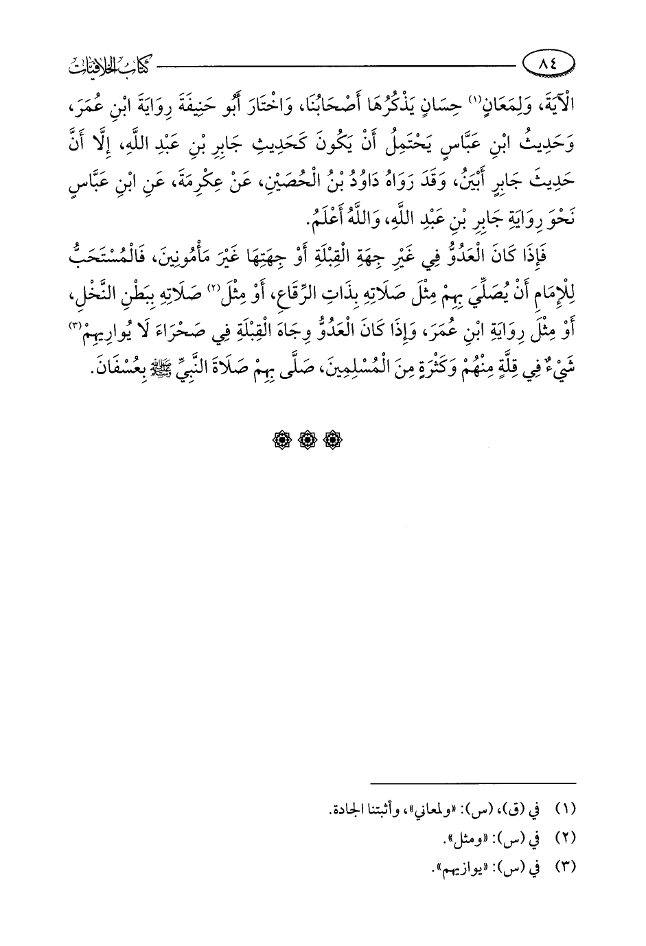 فَإِذَا كَانَ الْعَدُوُّ فِي غَيْرِ جِهَةِ الْقِبْلَةِ أَوْ جِهَتِهَا غَيْرَ مَأْمُونِينَ، فَالْمُسْتَحَبُّ لِلْإِمَامِ أَنْ يُصَلِّيَ بِهِمْ مِثْلَ صَلَاتِهِ بِذَاتِ الرِّقَاعِ، أَوْ مِثْلَ (¬2) صَلَاتِهِ بِبَطْنِ النَّخْلِ، أَوْ مِثْلَ رِوَايَةِ ابْنِ عُمَرَ، وَإِذَا كَانَ الْعَدُوُّ وِجَاهَ الْقِبْلَةِ فِي صَحْرَاءَ لَا يُوارِيهِمْ (¬3) شَيْءٌ فِي قِلَّةٍ مِنْهُمْ وَكَثْرَةٍ مِنَ الْمُسْلِمِينَ، صَلَّى بِهِمْ صَلَاةَ النَّبِيِّ - صلى الله عليه وسلم - بِعُسْفَانَ.