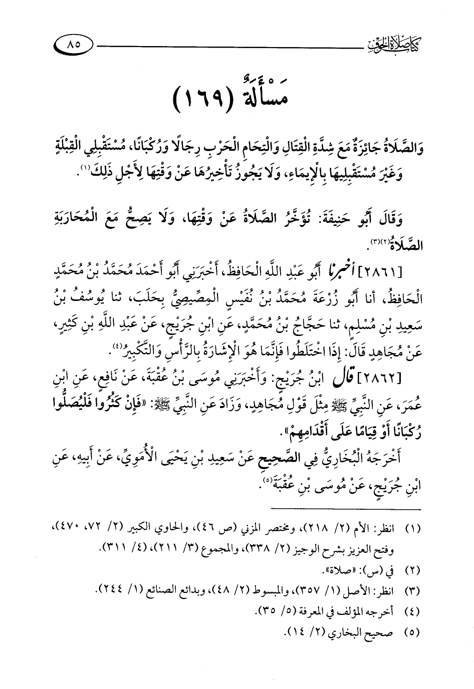 مَسْأَلَةٌ (169): وَالصَّلَاةُ جَائِزَةٌ مَعَ شِدَّةِ الْقِتَالِ وَالْتِحَامِ الْحَرْبِ رِجَالًا وَرُكْبَانًا، مُسْتَقْبِلِي الْقِبْلَةٍ وَغَيْرَ مُسْتَقْبِلِيهَا بِالْإِيمَاءِ، وَلَا يَجُوزُ تَأْخِيرُهَا عَنْ وَقْتِهَا لِأَجْلِ ذَلِكَ (¬1).