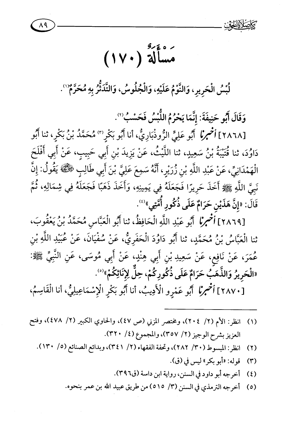 [2868] أخبرنا أَبُو عَلِيٍّ الرُّوذْبَارِيُّ، أنا أَبُو بَكْرٍ (¬3) مُحَمَّدُ بْنُ بَكْرٍ، ثنا أَبُو دَاوُدَ، ثنا قُتَيْبَةُ بْنُ سَعِيدٍ، ثنا اللَّيْثُ، عَنْ يَزِيدَ بْنِ أَبِي حَبِيبٍ، عَنْ أَبِي أَفْلَحَ الْهَمْدَانِيِّ، عَنْ عَبْدِ اللَّهِ بْنِ زُرَيْرٍ، أنَّهُ سَمِعَ عَلِيَّ بْنَ أَبِي طَالِبٍ - رضي الله عنه - يَقُولُ: إِنَّ نَبِيَّ اللَّهِ - صلى الله عليه وسلم - أَخَذَ حَرِيرًا فَجَعَلَهُ فِي يَمِينِهِ، وَأَخَذَ ذَهَبًا فَجَعَلَهُ فِي شِمَالِهِ، ثُمَّ قَالَ: "إِنَّ هَذَيْنِ حَرَامٌ عَلَى ذُكُورِ أُمَّتِي" (¬4).
