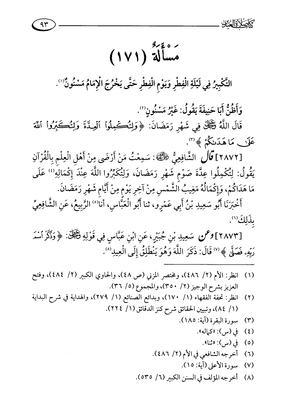 مَسْأَلَةٌ (171): التَّكْبِيرُ فِي لَيْلَةِ الْفِطْرِ وَيَوْمِ الْفِطْرِ حَتَّى يَخْرُجَ الْإِمَامُ مَسْنُونٌ (¬1).