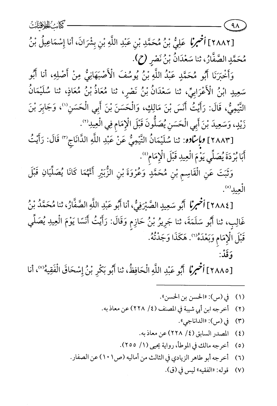 [2884] أخبرنا أَبُو سَعِيدٍ الصَّيْرَفِيُّ، أنا أَبُو عَبْدِ اللَّهِ الصَّفَّارُ، ثنا مُحَمَّدُ بْنُ غَالِبٍ، ثنا أَبُو سَلَمَةَ، ثنا جَرِيرُ بْنُ حَازِمٍ وَقَالَ: رَأَيْتُ أَنَسًا يَوْمَ الْعِيدِ يُصَلِّي قَبْلَ الْإِمَامِ وَبَعْدَهُ (¬6). هَكَذَا وَجَدْتُهُ.
