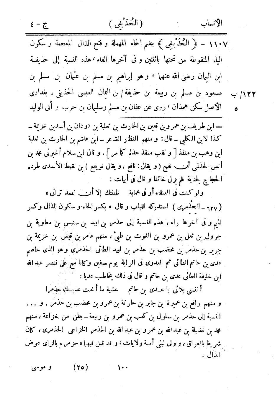 (627- الحذمرى) استدركه اللباب وقال «بكسر الحاء وسكون الذال وكسر الميم وفي آخرها راء، هذه النسبة إلى حذمر بن لبيد بن سنبس بن معاوية بن جرول بن ثعل بن عمرو بن الغوث بن طيِّئ، منهم عامر بن قيس بن خزيمة بن جرير بن حذمر بن محضب بن حذمر بن لبيد الطائي الحذمرى وهو الّذي خاصم عدي بن حاتم الطائي ثم العدوي في الراية يوم صفين وكانا مع على فنصر عبد الله ابن خليفة الطائي عدي بن حاتم وقال في ذلك يخاطب عديا: