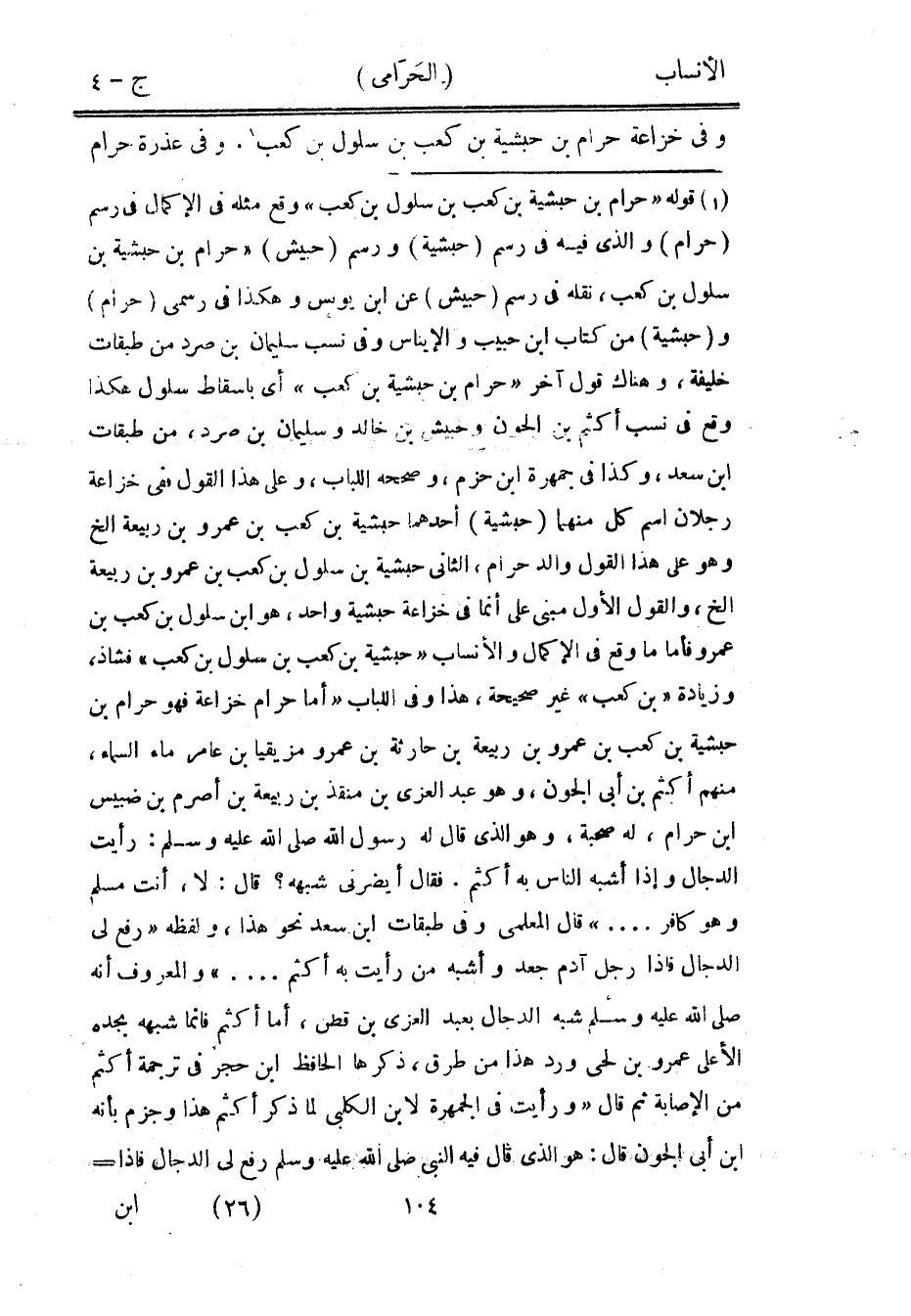 [1] قوله «حرام بن حبشية بن كعب بن سلول بن كعب» وقع مثله في الإكمال في رسم (حرام) والّذي فيه في رسم (حبشية) ورسم (حبشية) «حرام بن حبشية بن سلول بن كعب، نقله في رسم (حبيش) عن ابن يونس وهكذا في رسمي (حرام) و (حبشية) من كتاب ابن حبيب والإيناس وفي نسب سليمان بن صرد من طبقات خليفة، وهناك قول آخر «حرام بن حبشية بن كعب» أي بإسقاط سلول هكذا وقع في نسب أكثم بن الجون وحبيش بن خالد وسليمان بن صرد، من طبقات ابن سعد، وكذا في جمهرة ابن حزم، وصححه اللباب، وعلى هذا القول ففي خزاعة رجلان اسم كل منهما (حبشية) أحدهما حبشية بن كعب بن عمرو بن ربيعة إلخ وهو على هذا القول والد حرام، الثاني حبشية بن سلول بن كعب بن عمرو بن ربيعة إلخ، والقول الأول مبنى على أنه في خزاعة حبشية واحد، هو ابن سلول بن كعب بن عمرو فأما ما وقع في الإكمال والأنساب «حبشية بن كعب بن سلول بن كعب» فشاذ، وزيادة «بن كعب» غير صحيحة، هذا وفي اللباب «أما حرام خزاعة فهو حرام بن حبشية بن كعب بن عمرو بن ربيعة بن حارثة بن عمرو مزيقياء بن عامر ماء السماء، منهم أكثم بن أبى الجون، وهو عبد العزى بن منقذ بن ربيعة بن أصرم بن ضبيس ابن حرام، له صحبة، وهو الّذي قال له رسول الله صلى الله عليه وسلم: رأيت الدجال وإذا أشبه الناس به أكثم. فقال أيضرني شبهه؟ قال: لا، أنت مسلم وهو كافر....» قال المعلمي وفي طبقات ابن سعد نحو هذا، ولفظه «رفع لي الدجال فإذا رجل آدم جعد وأشبه من رأيت به أكثم....» والمعروف أنه صلى الله عليه وسلم شبه الدجال بعبد العزى بن قطن، أما أكثم فإنما شبهه بجده الأعلى عمرو بن لحي ورد هذا من طرق، ذكرها الحافظ ابن حجر في ترجمة أكثم من الإصابة ثم قال «ورأيت في الجمهرة لابن الكلبي لما ذكر أكثم هذا وجزم بأنه ابن أبى الجون قال: هو الّذي قال فيه النبي صلى الله عليه وسلم رفع لي الدجال فإذا