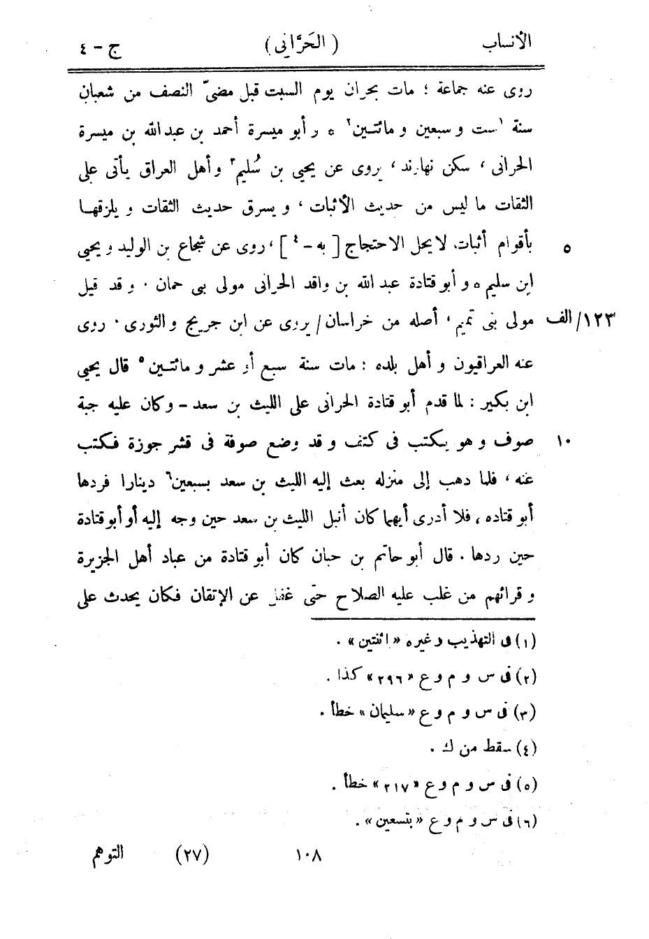 روى عنه جماعة، مات بحران يوم السبت قبل مضىّ النصف من شعبان سنة [1] ست وسبعين ومائتين [2] وأبو ميسرة أحمد بن عبد الله بن ميسرة الحراني، سكن نهاوند، يروى عن يحيى بن سليم [3] وأهل العراق يأتى على الثقات ما ليس من حديث الأثبات، ويسرق حديث الثقات ويلزقها بأقوام أثبات لا يحل الاحتجاج [به-[4]] ، روى عن شجاع بن الوليد ويحيى ابن سليم وأبو قتادة عبد الله بن واقد الحراني مولى بنى حمان. وقد قيل مولى بنى تميم، أصله من خراسان/ يروى عن ابن جريج والثوري، روى عنه العراقيون وأهل بلده: مات سنة سبع أو عشر ومائتين [5] قال يحيى ابن بكير: لما قدم أبو قتادة الحراني على الليث بن سعد- وكان عليه جبة صوف وهو يكتب في كتف وقد وضع صوفة في قشر جوزة فكتب عنه، فلما ذهب إلى منزلة بعث إليه الليث بن سعد بسبعين [6] دينارا فردها أبو قتادة، فلا أدرى أيهما كان أنبل الليث بن سعد حين وجه إليه أو أبو قتادة حين ردها. قال أبو حاتم بن حبان كان أبو قتادة من عباد أهل الجزيرة وقرائهم من غلب عليه الصلاح حتى غفل عن الإتقان فكان يحدث على
