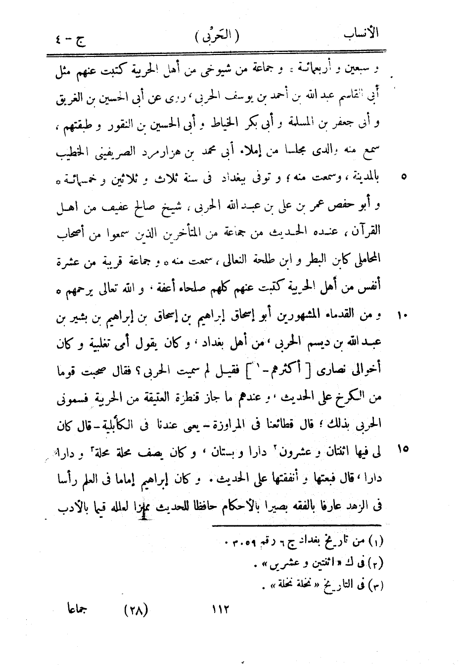 وسبعين وأربعمائة وجماعة من شيوخي من أهل الحربية كتبت عنهم مثل أبى القاسم عبد الله بن أحمد بن يوسف الحربي، روى عن أبى الحسين بن الغريق وأبى جعفر بن المسلمة وأبى بكر الخياط وأبى الحسين بن النقور وطبقتهم، سمع منه والدي مجلسا من إملاء أبى محمد بن هزارمرد الصريفيني الخطيب بالمدينة، وسمعت منه، وتوفى ببغداد في سنة ثلاث وثلاثين وخمسمائة وأبو حفص عمر بن على بن عبد الله الحربي، شيخ صالح عفيف من أهل القرآن، عنده الحديث من جماعة من المتأخرين الذين سمعوا من أصحاب المحاملي كابن البطر وابن طلحة النعالى، سمعت منه، وجماعة قريبة من عشرة أنفس من أهل الحربية كتبت عنهم كلهم صلحاء أعفة، والله تعالى يرحمهم ومن القدماء المشهورين أبو إسحاق إبراهيم بن إسحاق بن إبراهيم بن بشير بن عبد الله بن ديسم الحربي، من أهل بغداد، وكان يقول أمى تغلبية وكان أخوالى نصارى [أكثرهم-[1]] فقيل لم سميت الحربي؟ فقال صحبت قوما من الكرخ على الحديث، وعندهم ما جاز قنطرة العتيقة من الحربية فسموني الحربي بذلك، قال قطائعنا في المراوزة- يعنى عندنا في الكابلية- قال كان لي فيها اثنتان وعشرون [2] دارا وبستان، وكان يصف محلة محلة [3] ودارا دارا، قال فبعتها وأنفقتها على الحديث. وكان إبراهيم إماما في العلم رأسا في الزهد عارفا بالفقه بصيرا بالأحكام حافظا للحديث مميزا لعلله فيما بالأدب