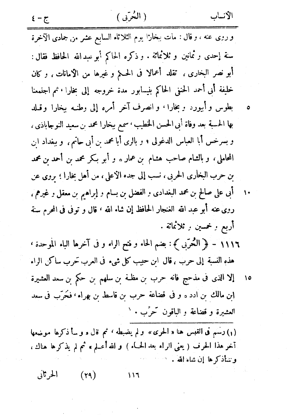 بضم الحاء وفتح الراء وفي آخرها الباء الموحدة، هذه النسبة إلى حرب، قال ابن حبيب كل شيء في العرب حرب ساكن الراء إلا الّذي في مذحج فإنه حرب بن مظة بن سلهم بن حكم بن سعد العشيرة ابن مالك بن أدد وفي قضاعة حرب بن قاسط بن بهراء، فحرب في سعد العشيرة وقضاعة والباقون حرب. [1]