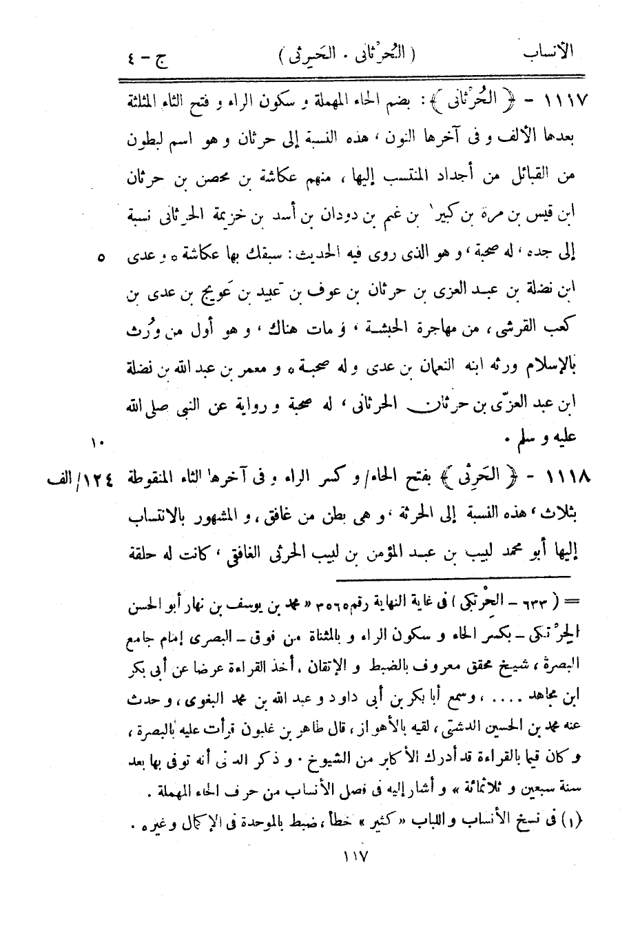 بضم الحاء المهملة وسكون الراء وفتح الثاء المثلثة بعدها الألف وفي آخرها النون، هذه النسبة إلى حرثان وهو اسم لبطون من القبائل من أجداد المنتسب إليها، منهم عكاشة بن محصن بن حرثان ابن قيس بن مرة بن كبير [1] بن غنم بن دودان بن أسد بن خزيمة الحرثانى نسبة إلى جده، له صحبة، وهو الّذي روى فيه الحديث: سبقك بها عكاشة وعدي ابن نضلة بن عبد العزى بن حرثان بن عوف بن عبيد بن عويج بن عدي بن كعب القرشي، من مهاجرة الحبشة، ومات هناك، وهو أول من ورث بالإسلام ورثه ابنه النعمان بن عدي وله صحبة ومعمر بن عبد الله بن نضلة ابن عبد العزّى بن حرثان الحرثانى، له صحبة ورواية عن النبي صلى الله عليه وسلم.