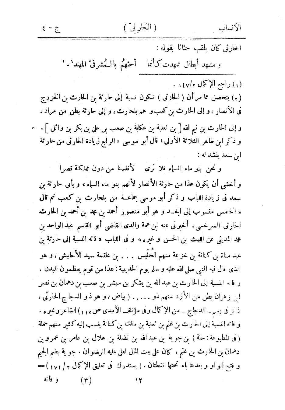 [2] يتحصل مما مر أن (الحارثي) تكون نسبة إلى حارثة بن الحارث بن الخزرج في الأنصار، وإلى الحارث بن كعب وهم بلحارث، وإلى حارثة بطن من مراد، وإلى الحارث بن تيم الله [بن ثعلبة بن كعابة بن صعب بن على بن بكر بن وائل] .