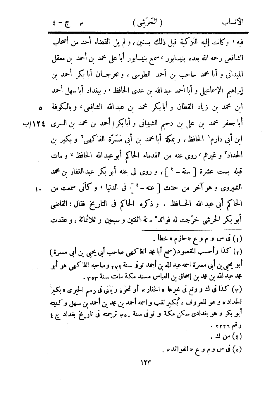 [3] كذا في ك ووقع في غيرها «الحفار» أو نحوه ويأتى في رسم الحيريّ «بكير الحداد» وهو المعروف، بكير لقب واسمه أحمد بن محمد بن أحمد بن سهل وكنيته أبو بكر وهو بغدادي سكن مكة وتوفى سنة 350 ترجمته في تاريخ بغداد ج 4 رقم 2226.