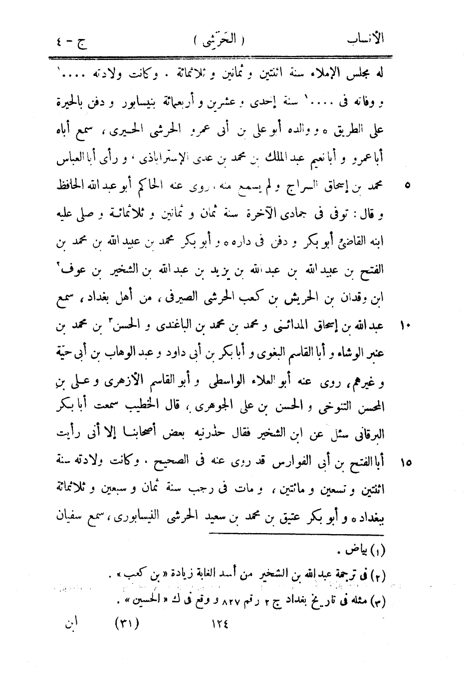 له مجلس الإملاء سنة اثنتين وثمانين وثلاثمائة. وكانت ولادته.... [1] ووفاته في.... [1] سنة إحدى وعشرين وأربعمائة بنيسابور ودفن بالحيرة على الطريق ووالده أبو على بن أبى عمرو الحرشيّ الحيريّ، سمع أباه أبا عمرو وأبا نعيم عبد الملك بن محمد بن عدي الأستراباذي، ورأى أبا العباس محمد بن إسحاق السراج ولم يسمع منه، روى عنه الحاكم أبو عبد الله الحافظ وقال: توفى في جمادى الآخرة سنة ثمان وثمانين وثلاثمائة وصلى عليه ابنه القاضي أبو بكر ودفن في داره وأبو بكر محمد بن عبيد الله بن محمد بن الفتح بن عبيد الله بن عبد الله بن يزيد بن عبد الله بن الشخير بن عوف [2] ابن وقدان بن الحريش بن كعب الحرشيّ الصيرفي، من أهل بغداد، سمع عبد الله بن إسحاق المدائني ومحمد بن محمد بن الباغندي والحسن [3] بن محمد بن عنبر الوشاء وأبا القاسم البغوي وأبا بكر بن أبى داود وعبد الوهاب بن أبى حيّة وغيرهم، روى عنه أبو العلاء الواسطي وأبو القاسم الأزهري وعلى بن المحسن التنوخي والحسن بن على الجوهري، قال الخطيب سمعت أبا بكر البرقاني سئل عن ابن الشخير فقال حذرنيه بعض أصحابنا إلا أنى رأيت أبا الفتح بن أبى الفوارس قد روى عنه في الصحيح. وكانت ولادته سنة اثنتين وتسعين ومائتين، ومات في رجب سنة ثمان وسبعين وثلاثمائة ببغداد وأبو بكر عتيق بن محمد بن سعيد الحرشيّ النيسابورىّ، سمع سفيان