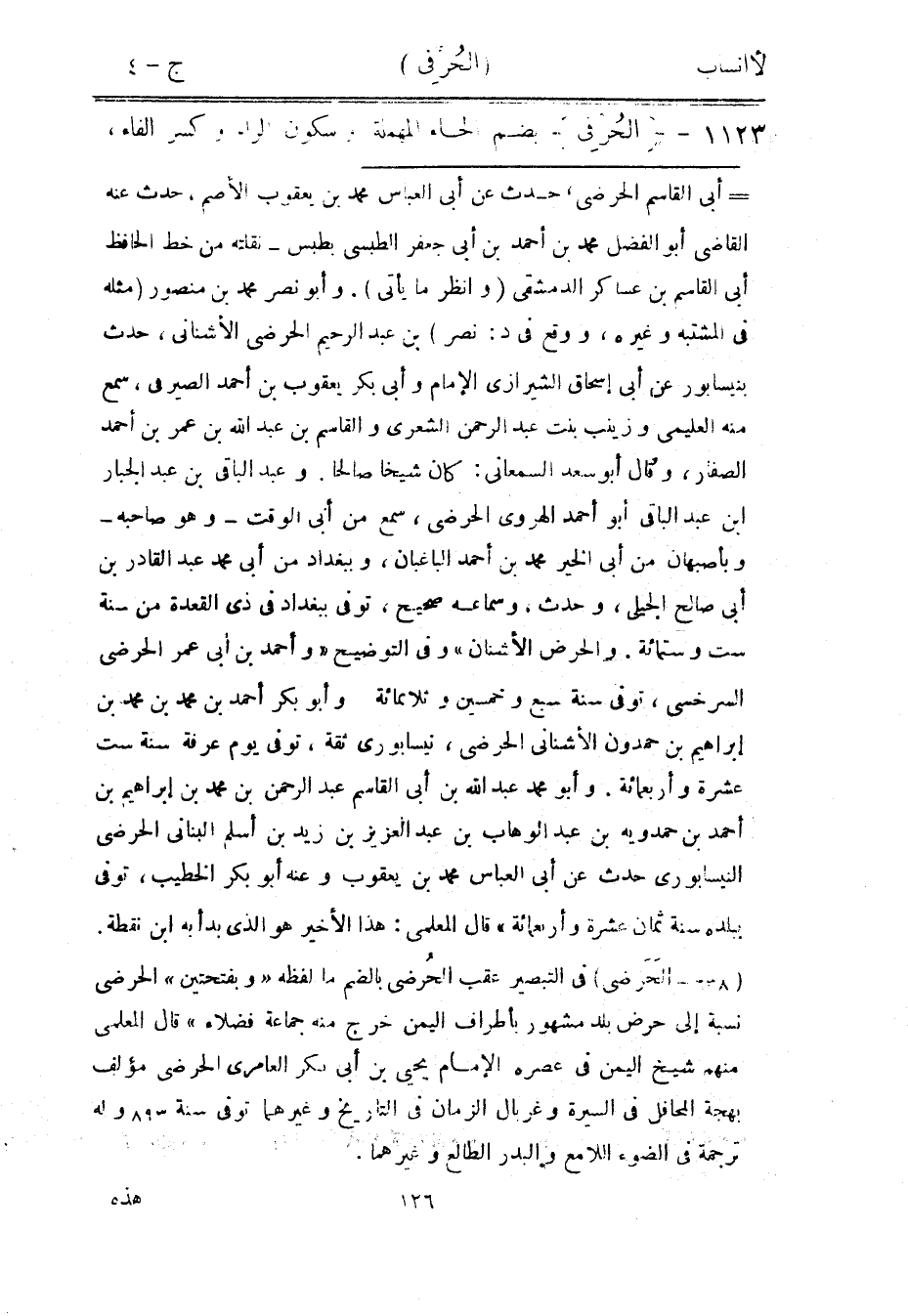 (638- الحرضى) في التبصير عقب الحرضى بالضم ما لفظه «وبفتحتين» الحرضى نسبة إلى حرض بلد مشهور بأطراف اليمن خرج منه جماعة فضلاء» قال المعلمي منهم شيخ اليمن في عصره الإمام يحيى بن أبى بكر العامري الحرضى مؤلف بهجة المحافل في السيرة وغربال الزمان في التاريخ وغيرهما توفى سنة 893 وله ترجمة في الضوء اللامع والبدر الطالع وغيرهما.
