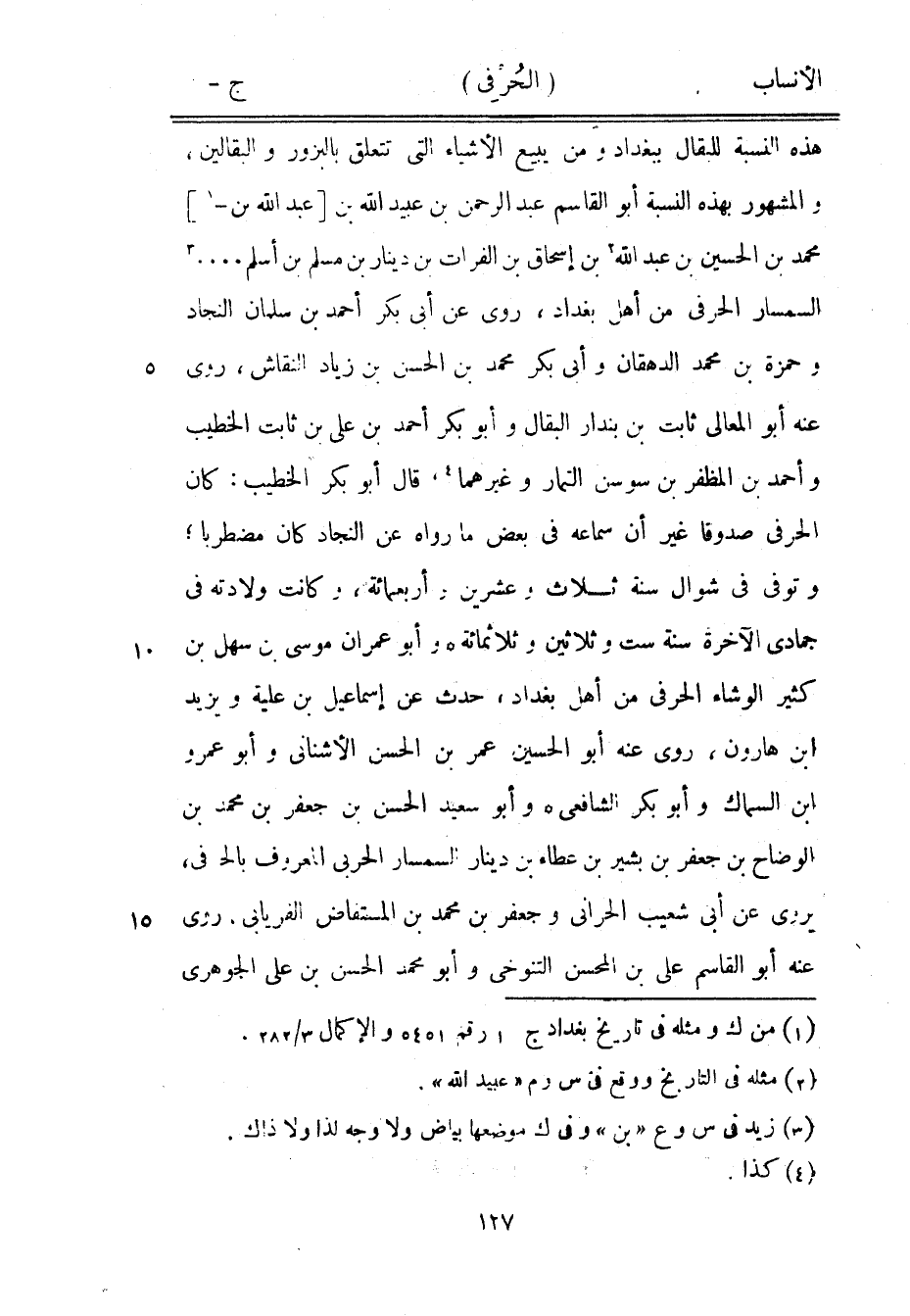 هذه النسبة للبقال ببغداد ومن يبيع الأشياء التي تتعلق بالبزور والبقالين، والمشهور بهذه النسبة أبو القاسم عبد الرحمن بن عبيد الله بن [عبد الله بن-[1]] محمد بن الحسين بن عبد الله [2] بن إسحاق بن الفرات بن دينار بن مسلم بن أسلم.... [3] السمسار الحرفى من أهل بغداد، روى عن أبى بكر أحمد بن سلمان النجاد وحمزة بن محمد الدهقان وأبى بكر محمد بن الحسن بن زياد النقاش، روى عنه أبو المعالي ثابت بن بندار البقال وأبو بكر أحمد بن على بن ثابت الخطيب وأحمد بن المظفر بن سوسن التمار وغيرهما [4] ، قال أبو بكر الخطيب: كان الحرفى صدوقا غير أن سماعه في بعض ما رواه عن النجاد كان مضطربا، وتوفى في شوال سنة ثلاث وعشرين وأربعمائة، وكانت ولادته في جمادى الآخرة سنة ست وثلاثين وثلاثمائة وأبو عمران موسى بن سهل بن كثير الوشاء الحرفى من أهل بغداد، حدث عن إسماعيل بن علية ويزيد ابن هارون، روى عنه أبو الحسين عمر بن الحسن الأشناني وأبو عمرو ابن السماك وأبو بكر الشافعيّ وأبو سعيد الحسن بن جعفر بن محمد بن الوضاح بن جعفر بن بشير بن عطاء بن دينار السمسار الحربي المعروف بالحرفي، يروى عن أبى شعيب الحراني وجعفر بن محمد بن المستفاض الفريابي، روى عنه أبو القاسم على بن المحسن التنوخي وأبو محمد الحسن بن على الجوهري