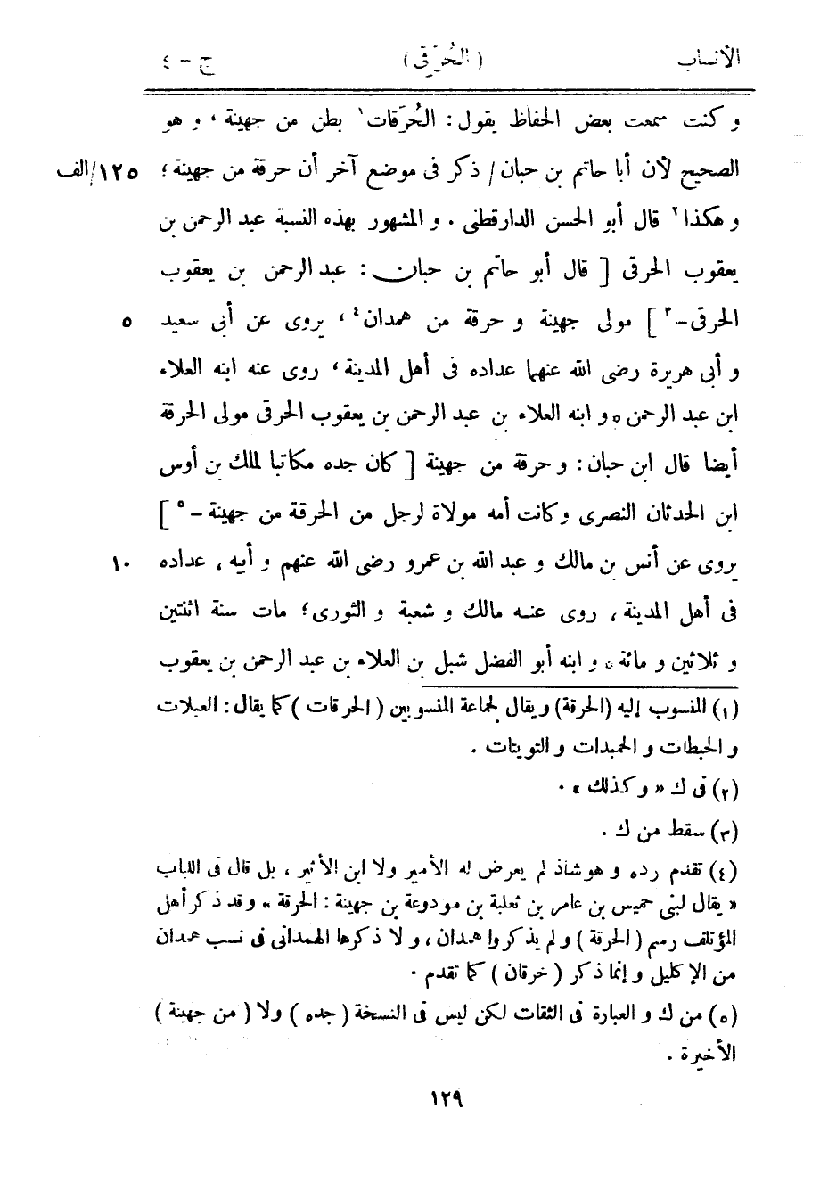 وكنت سمعت بعض الحافظ يقول: الحرقات [1] بطن من جهينة، وهو الصحيح لأن أبا حاتم بن حبان/ ذكر في موضع آخر أن حرقة من جهينة، وهكذا [2] قال أبو الحسن الدار قطنى. والمشهور بهذه النسبة عبد الرحمن بن يعقوب الحرقى [قال أبو حاتم بن حبان: عبد الرحمن بن يعقوب الحرقى-[3]] مولى جهينة وحرقة من همدان [4] ، يروى عن أبى سعيد وأبى هريرة رضى الله عنهما عداده في أهل المدينة، روى عنه ابنه العلاء ابن عبد الرحمن وابنه العلاء بن عبد الرحمن بن يعقوب الحرقى مولى الحرقة أيضا قال ابن حبان: وحرقة من جهينة [كان جده مكاتبا لملك بن أوس ابن الحدثان النصري وكانت أمه مولاة لرجل من الحرقة من جهينة-[5]] يروى عن أنس بن مالك وعبد الله بن عمرو رضى الله عنهم وأبيه، عداده في أهل المدينة، روى عنه مالك وشعبة والثوري، مات سنة اثنتين وثلاثين ومائة وابنه أبو الفضل شبل بن العلاء بن عبد الرحمن بن يعقوب