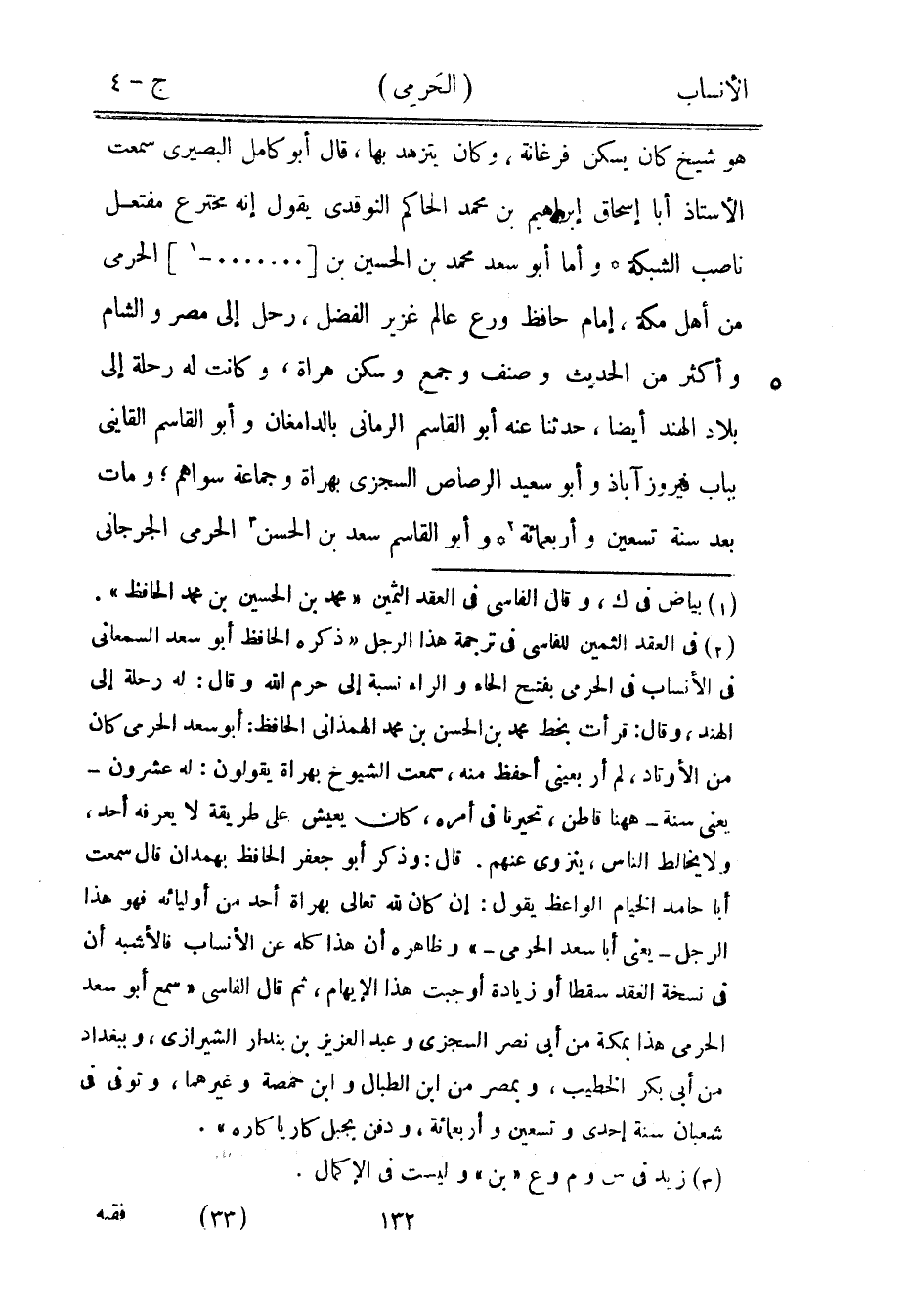 [2] في العقد الثمين للفاسى في ترجمة هذا الرجل «ذكره الحافظ أبو سعد السمعاني في الأنساب في الحرمي بفتح الحاء والراء نسبة إلى حرم الله وقال: له رحلة إلى الهند، وقال: قرأت بخط محمد بن الحسن بن محمد الهمدانيّ الحافظ: أبو سعد الحرمي كان من الأوتاد، لم أربعينى أحفظ منه، سمعت الشيوخ بهراة يقولون: له عشرون- يعنى سنة- هاهنا قاطن، تحيرنا في أمره، كان يعيش على طريقة لا يعرفه أحد، ولا يخالط الناس، ينزوى عنهم. قال: وذكر أبو جعفر الحافظ بهمدان قال سمعت أبا حامد الخيام الواعظ يقول: إن كان للَّه تعالى بهراة أحد من أوليائه فهو هذا الرجل- يعنى أبا سعد الحرمي-» وظاهره أن هذا كله عن الأنساب فالأشبه أن في نسخة العقد سقطا أو زيادة أوجبت هذا الإيهام، ثم قال الفاسى «سمع أبو سعد الحرمي هذا بمكة من أبى نصر السجزى وعبد العزيز بن بندار الشيرازي، وببغداد من أبى بكر الخطيب، وبمصر من ابن الطبال وابن حمصة وغيرهما، وتوفى في شعبان سنة إحدى وتسعين وأربعمائة، ودفن بجبل كاريا كاره» .