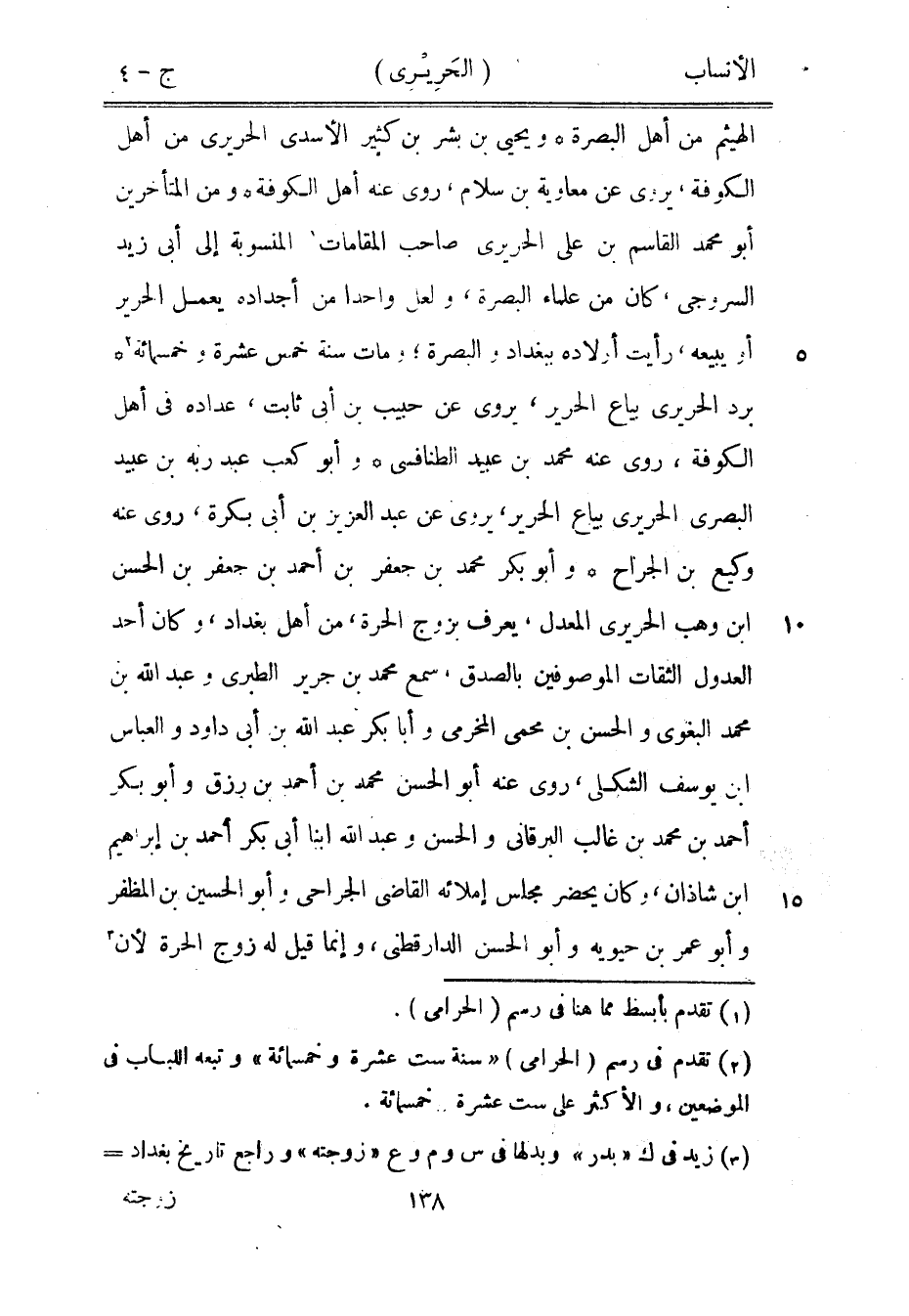 الهيثم من أهل البصرة ويحيى بن بشر بن كثير الأسدي الحريري من أهل الكوفة، يروى عن معاوية بن سلام، روى عنه أهل الكوفة ومن المتأخرين أبو محمد القاسم بن على الحريري صاحب المقامات [1] المنسوبة إلى أبى زيد السروجي، كان من علماء البصرة، ولعل واحدا من أجداده يعمل الحرير أو يبيعه، رأيت أولاده ببغداد والبصرة، ومات سنة خمس عشرة وخمسمائة [2] برد الحريري بياع الحرير، يروى عن حبيب بن أبى ثابت، عداده في أهل الكوفة، روى عنه محمد بن عبيد الطنافسي وأبو كعب عبد ربه بن عبيد البصري الحريري بياع الحرير، يروى عن عبد العزيز بن أبى بكرة، روى عنه وكيع بن الجراح وأبو بكر محمد بن جعفر بن أحمد بن جعفر بن الحسن ابن وهب الحريري المعدل، يعرف بزوج الحرة، من أهل بغداد، وكان أحد العدول الثقات الموصوفين بالصدق، سمع محمد بن جرير الطبري وعبد الله بن محمد البغوي والحسن بن محمى المخرمي وأبا بكر عبد الله بن أبى داود والعباس ابن يوسف الشكلى، روى عنه أبو الحسن محمد بن أحمد بن رزق وأبو بكر أحمد بن محمد بن غالب البرقاني والحسن وعبد الله ابنا أبى بكر أحمد بن إبراهيم ابن شاذان، وكان يحضر مجلس إملائه القاضي الجراحي وأبو الحسين بن المظفر وأبو عمر بن حيويه وأبو الحسن الدار قطنى، وإنما قيل له زوج الحرة لأن [3]