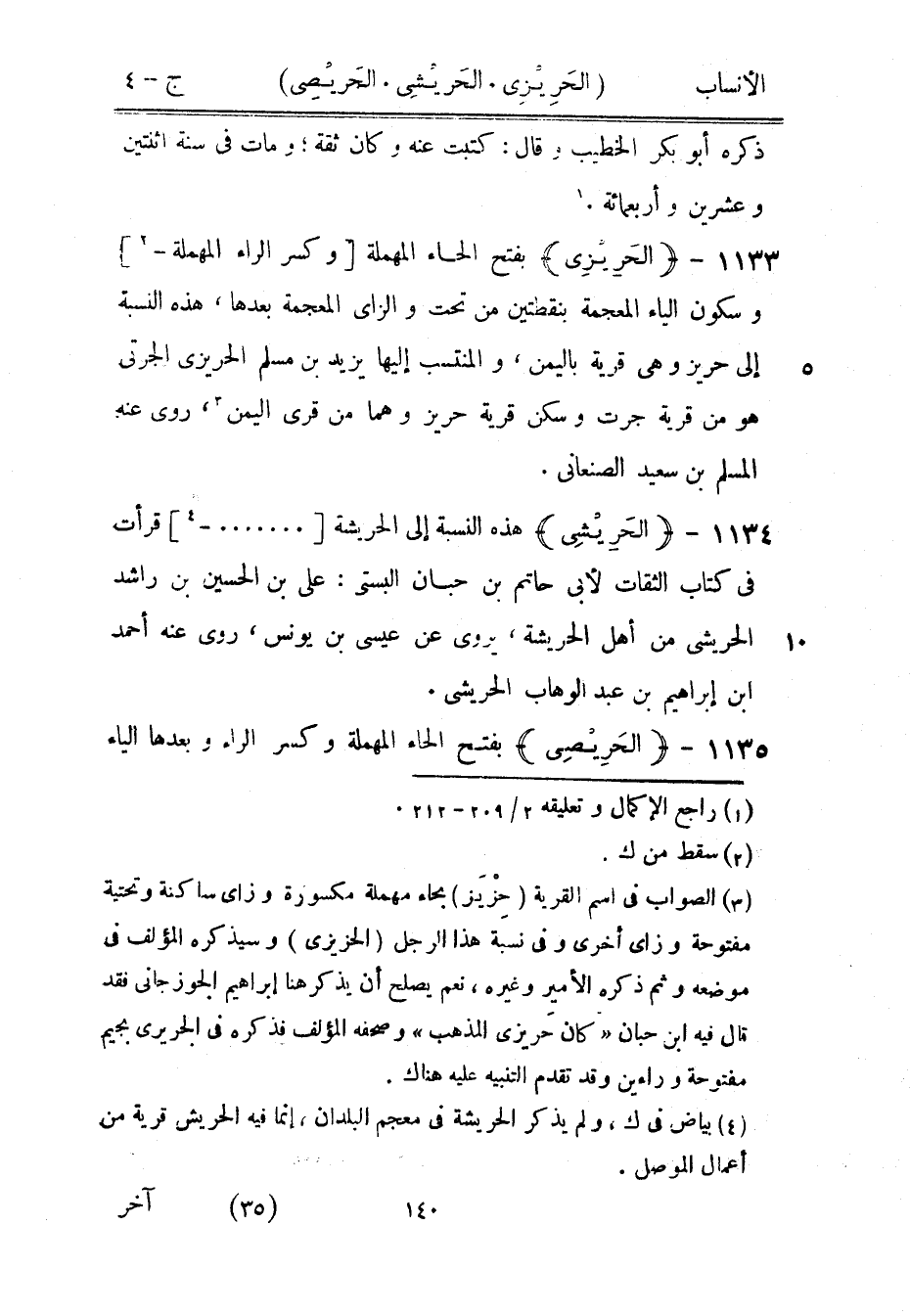 [3] الصواب في اسم القرية (حزيز) بحاء مهملة مكسورة وزاي ساكنة وتحتية مفتوحة وزاي أخرى وفي نسبة هذا الرجل (الحزيزى) وسيذكره المؤلف في موضعه وثم ذكره الأمير وغيره، نعم يصلح أن يذكر هنا إبراهيم الجوزجاني فقد قال فيه ابن حبان «كان حريزي المذهب» وصحفه المؤلف فذكره في الجريريّ بجيم مفتوحة وراءين وقد تقدم التنبيه عليه هناك.