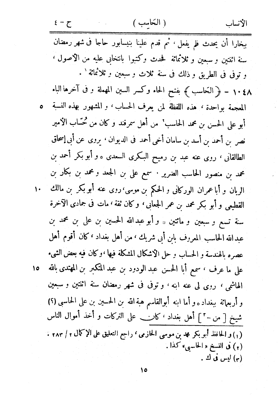 بفتح الحاء وكسر السين المهملة وفي آخرها الباء المعجمة بواحدة، هذه اللفظة لمن يعرف الحساب، والمشهور بهذه النسبة أبو على الحسن بن محمد الحاسب [2] من أهل سمرقند وكان من حسّاب الأمير نصر بن أحمد بن أسد بن سامان أخى أحمد في الديوان، يروى عن أبى إسحاق الطالقانيّ، روى عنه عبد بن رميح البكري السعدي وأبو بكر أحمد بن محمد بن منصور الحاسب الضرير. سمع على بن الجعد ومحمد بن بكار بن الريان وأبا عمران الوركانى والحكم بن موسى، روى عنه أبو بكر بن مالك القطيعي وأبو بكر محمد بن عمر الجعابيّ، وكان ثقة، مات في جمادى الآخرة سنة تسع وسبعين ومائتين وأبو عبد الله الحسين بن على بن محمد بن عبد الله الحاسب المعروف بابن أبى شريك، من أهل بغداد، كان أقوم أهل عصره بالهندسة والحساب وحل الأشكال المشكلة فيها، وكان فيه بعض الشيء على ما عرف، سمع أبا الحسن عبد الودود بن عبد المتكبر بن المهتدي باللَّه الهاشمي، روى لي عنه ابنه، وتوفى في شهر رمضان سنة اثنتين وسبعين وأربعمائة ببغداد وأما ابنه أبو القاسم هبة الله بن الحسين بن على الحاسبى (؟) شيخ [من-[3]] أهل بغداد، كان على التركات وأخذ أموال الناس