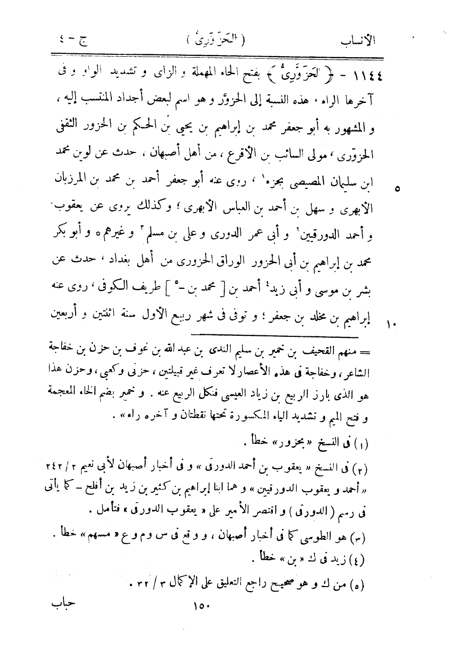 بفتح الحاء المهملة والزاى وتشديد الواو وفي آخرها الراء، هذه النسبة إلى الحزوّر وهو اسم لبعض أجداد المنتسب إليه، والمشهور به أبو جعفر محمد بن إبراهيم بن يحيى بن الحكم بن الحزور الثقفي الحزوّرى، مولى السائب بن الأقرع، من أهل أصبهان، حدث عن لوين محمد ابن سليمان المصيصي بجزء [1] ، روى عنه أبو جعفر أحمد بن محمد بن المرزبان الأبهري وسهل بن أحمد بن العباس الأبهري، وكذلك يروى عن يعقوب وأحمد الدورقيين [2] وأبى عمر الدوري وعلى بن مسلم [3] وغيرهم وأبو بكر محمد بن إبراهيم بن أبى الحزور الوراق الحزورى من أهل بغداد، حدث عن بشر بن موسى وأبى زيد [4] أحمد بن [محمد بن-[5]] طريف الكوفي، روى عنه إبراهيم بن مخلد بن جعفر، وتوفى في شهر ربيع الأول سنة اثنتين وأربعين