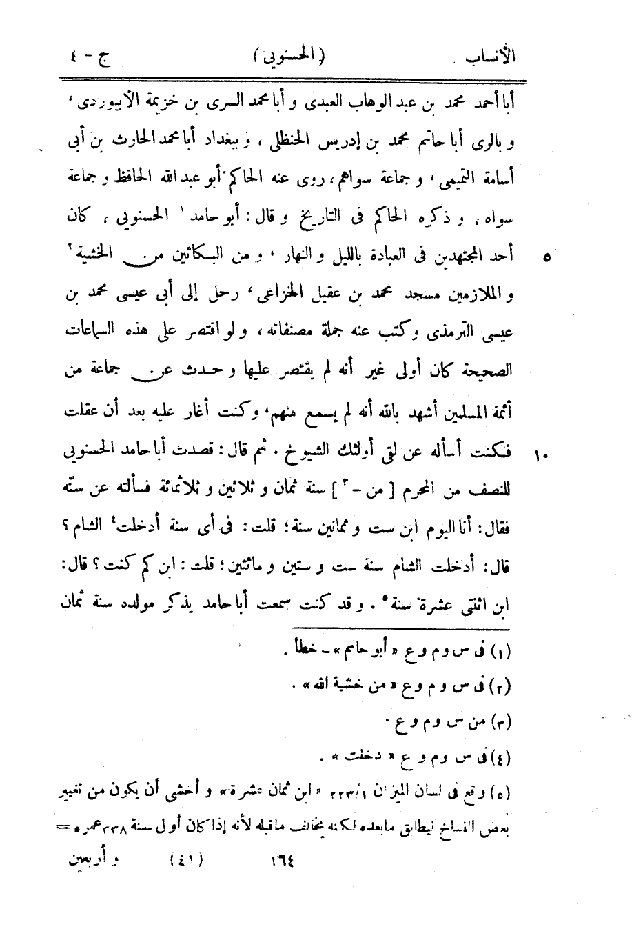 أبا أحمد محمد بن عبد الوهاب العبديّ وأبا محمد السري بن خزيمة الأبيوردي، وبالري أبا حاتم محمد بن إدريس الحنظليّ، وببغداد أبا محمد الحارث بن أبى أسامة التميمي، وجماعة سواهم، روى عنه الحاكم أبو عبد الله الحافظ وجماعة سواه، وذكره الحاكم في التاريخ وقال: أبو حامد [1] الحسنويى، كان أحد المجتهدين في العبادة بالليل والنهار، ومن البكاءين من الخشية [2] والملازمين مسجد محمد بن عقيل الخزاعي، رحل إلى أبى عيسى محمد بن عيسى الترمذي وكتب عنه جملة مصنفاته، ولو اقتصر على هذه السماعات الصحيحة كان أولى غير أنه لم يقتصر عليها وحدث عن جماعة من أئمة المسلمين أشهد باللَّه أنه لم يسمع منهم، وكنت أغار عليه بعد أن عقلت فكنت أسأله عن لقي أولئك الشيوخ. ثم قال: قصدت أبا حامد الحسنويى للنصف من المحرم [من-[3]] سنة ثمان وثلاثين وثلاثمائة فسألته عن سنّه فقال: أنا اليوم ابن ست وثمانين سنة، قلت: في أي سنة أدخلت [4] الشام؟