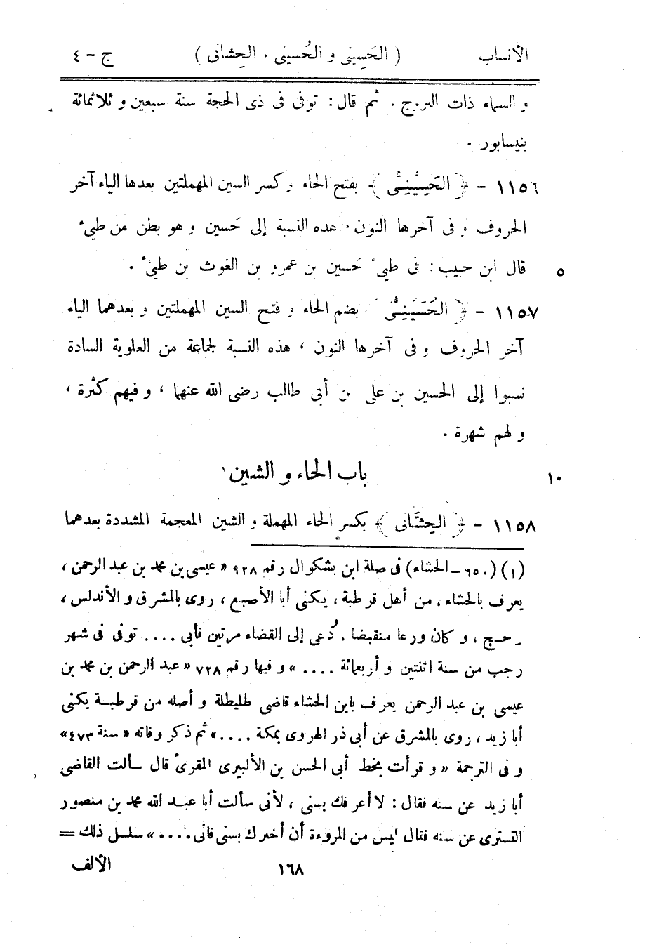 [1] (650- الحشاء) في صلة ابن بشكوال رقم 928 «عيسى بن محمد بن عبد الرحمن، يعرف بالحشاء، من أهل قرطبة، يكنى أبا الأصبع، روى بالمشرق والأندلس، وحجَّ، وكان ورعا منقبضا، دعي إلى القضاء مرتين فأبى.... توفى في شهر رجب من سنة اثنتين وأربعمائة....» وفيها رقم 728 «عبد الرحمن بن محمد بن عيسى بن عبد الرحمن يعرف بابن الحشاء قاضى طليطلة وأصله من قرطبة يكنى أبا زيد، روى بالمشرق عن أبى ذر الهروي بمكة ... » ثم ذكر وفاته «سنة 473» وفي الترجمة «وقرأت بخط أبى الحسن بن الإلبيري المقرئ قال سألت القاضي أبا زيد عن سنه فقال: لا أعرفك بسنى، لأني سألت أبا عبد الله محمد بن منصور التستري عن سنه فقال ليس من المروءة أن أخبرك بسنى فانى....» سلسل ذلك