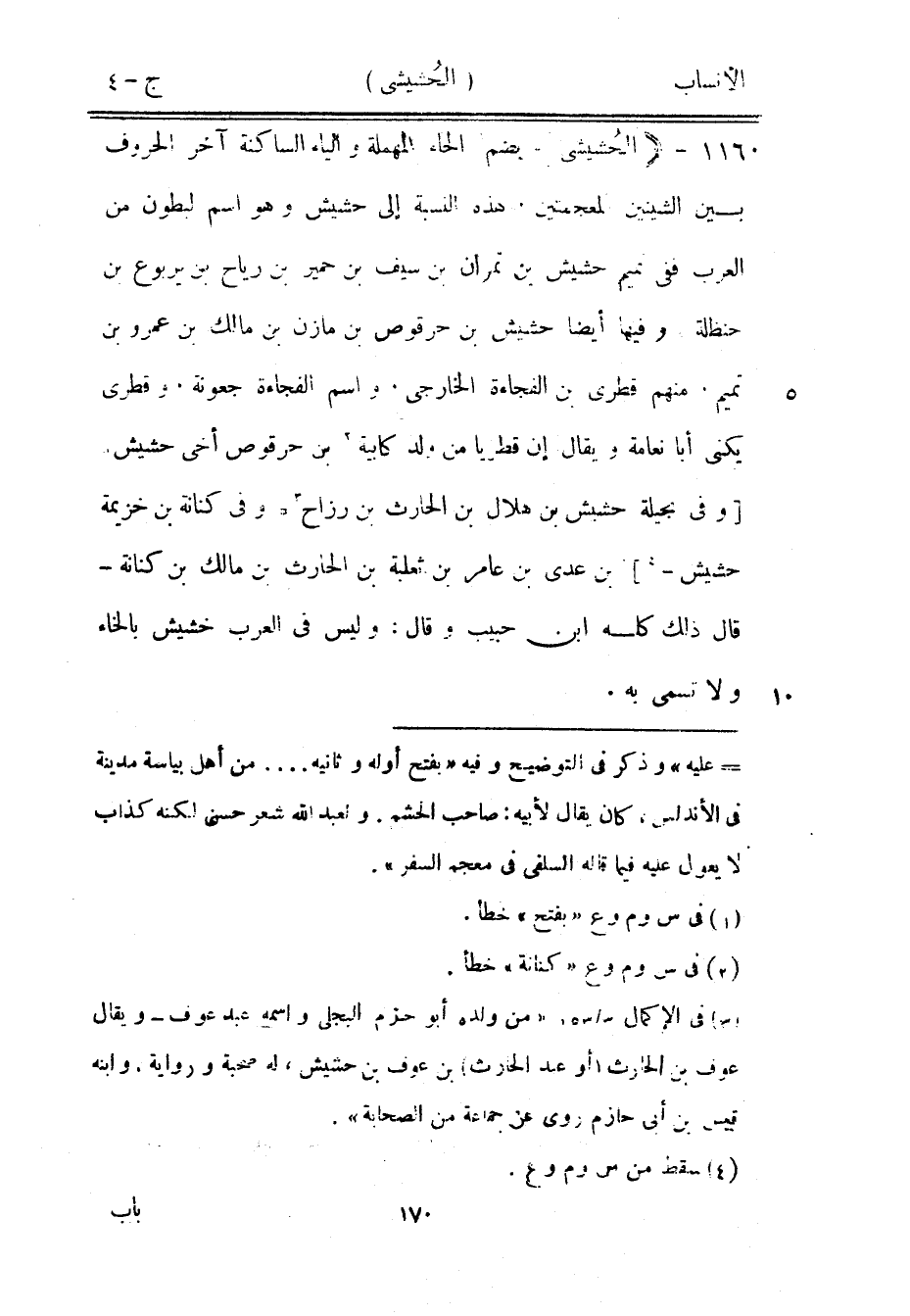 بضم الحاء المهملة [1] والياء الساكنة آخر الحروف بين الشينين لمعجمتين، هذه النسبة إلى حشيش وهو اسم لبطون من العرب ففي تميم حشيش بن نمران بن سيف بن حمير بن رياح بن يربوع بن حنظلة وفيها أيضا حشيش بن حرقوص بن مازن بن مالك بن عمرو بن تميم. منهم قطري بن الفجاءة الخارجي، واسم الفجاءة جعونة، وقطري يكنى أبا نعامة ويقال إن قطريا من ولد كابية [2] بن حرقوص أخى حشيش [وفي بجيلة حشيش بن هلال بن الحارث بن رزاح [3] وفي كنانة بن خزيمة حشيش-[4]] ابن عدي بن عامر بن ثعلبة بن الحارث بن مالك بن كنانة- قال ذلك كله ابن حبيب وقال: وليس في العرب خشيش بالخاء ولا تسمى به.