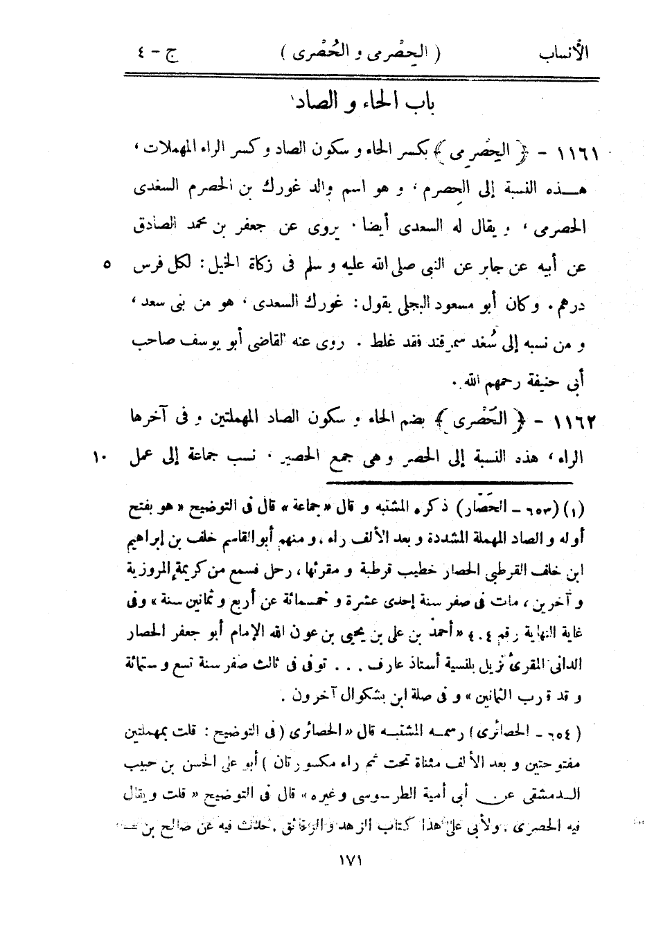 بضم الحاء وسكون الصاد المهملتين وفي آخرها الراء، هذه النسبة إلى الحصر وهي جمع الحصير، نسب جماعة إلى عمل