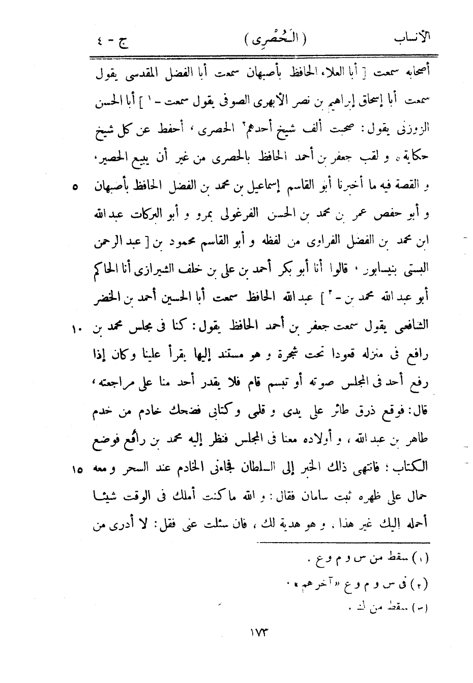 أصحابه سمعت [أبا العلاء الحافظ بأصبهان سمعت أبا الفضل المقدسي يقول سمعت أبا إسحاق إبراهيم بن نصر الأبهري الصوفي يقول سمعت-[1]] أبا الحسن الزوزنى يقول: صحبت ألف شيخ أحدهم [2] الحصرى، أحفظ عن كل شيخ حكاية ولقب جعفر بن أحمد الحافظ بالحصري من غير أن يبيع الحصير، والقصة فيه ما أخبرنا أبو القاسم إسماعيل بن محمد بن الفضل الحافظ بأصبهان وأبو حفص عمر بن محمد بن الحسن الفرغولى بمرو وأبو البركات عبد الله ابن محمد بن الفضل الفراوي من لفظه وأبو القاسم محمود بن [عبد الرحمن البستي بنيسابور، قالوا أنا أبو بكر أحمد بن على بن خلف الشيرازي أنا الحاكم أبو عبد الله محمد بن-[3]] عبد الله الحافظ سمعت أبا الحسين أحمد بن الخضر الشافعيّ يقول سمعت جعفر بن أحمد الحافظ يقول: كنا في مجلس محمد بن رافع في منزله قعودا تحت شجرة وهو مستند إليها يقرأ علينا وكان إذا رفع أحد في المجلس صوته أو تبسم قام فلا يقدر أحد منا على مراجعته، قال: فوقع ذرق طائر على يدي وقلمي وكتابي فضحك خادم من خدم طاهر بن عبد الله، وأولاده معنا في المجلس فنظر إليه محمد بن رافع فوضع الكتاب، فانتهى ذلك الخبر إلى السلطان فجاءني الخادم عند السحر ومعه حمال على ظهره ثبت سامان فقال: والله ما كنت أملك في الوقت شيئا أحمله إليك غير هذا، وهو هدية لك، فان سئلت عنى فقل: لا أدرى من