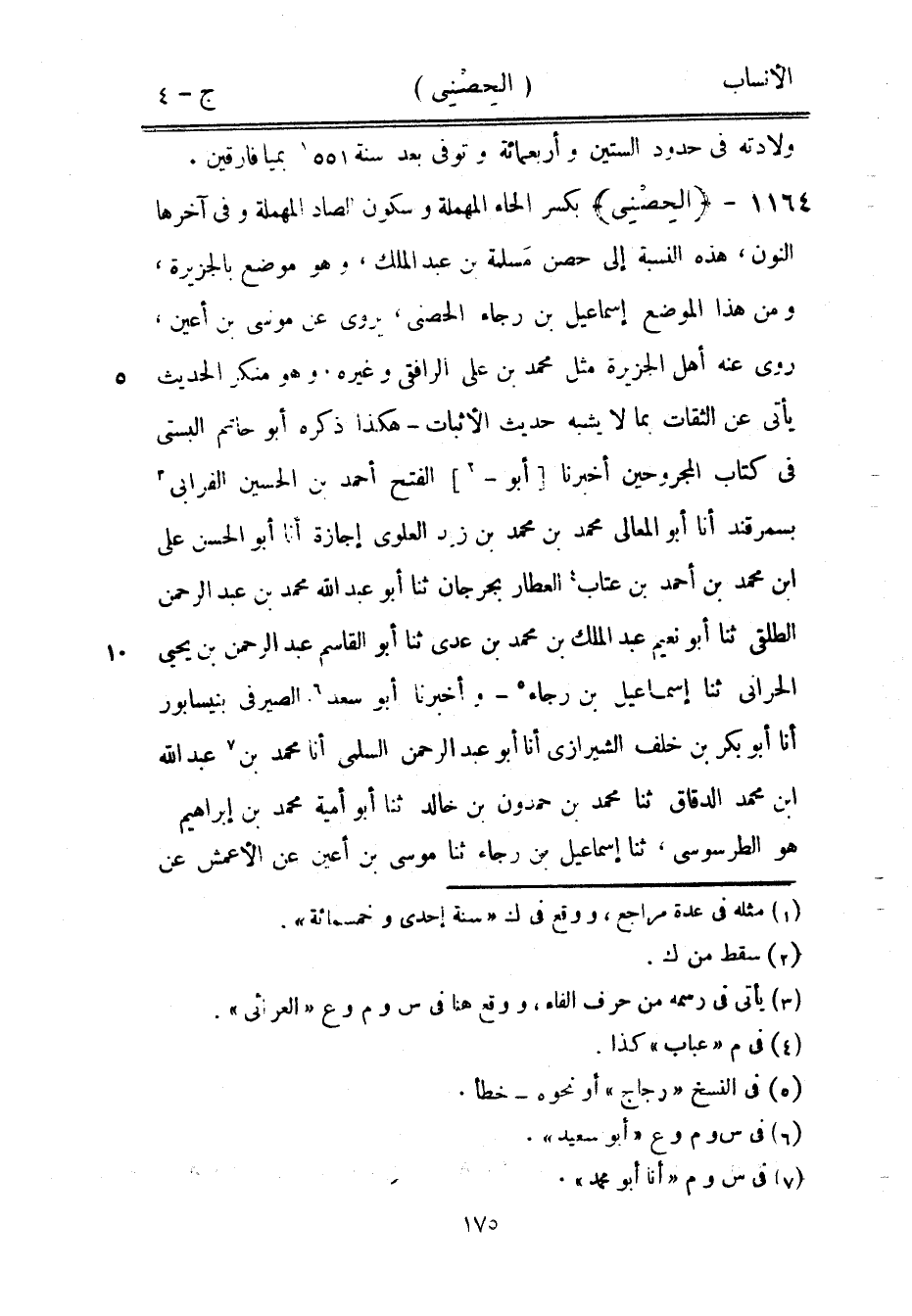 بكسر الحاء المهملة وسكون الصاد المهملة وفي آخرها النون، هذه النسبة إلى حصن مسلمة بن عبد الملك، وهو موضع بالجزيرة، ومن هذا الموضع إسماعيل بن رجاء الحصنى، يروى عن موسى بن أعين، روى عنه أهل الجزيرة مثل محمد بن على الرافقي وغيره، وهو منكر الحديث يأتى عن الثقات بما لا يشبه حديث الأثبات- هكذا ذكره أبو حاتم البستي في كتاب المجروحين أخبرنا [أبو-[2]] الفتح أحمد بن الحسين الفرابى [3] بسمرقند أنا أبو المعالي محمد بن محمد بن زيد العلويّ إجازة أنا أبو الحسن على ابن محمد بن أحمد بن عتاب [4] العطار بجرجان ثنا أبو عبد الله محمد بن عبد الرحمن الطلقي ثنا أبو نعيم عبد الملك بن محمد بن عدي ثنا أبو القاسم عبد الرحمن بن يحيى الحراني ثنا إسماعيل بن رجاء [5]- وأخبرنا أبو سعد [6] الصيرفي بنيسابور أنا أبو بكر بن خلف الشيرازي أنا أبو عبد الرحمن السلمي أنا محمد بن [7] عبد الله ابن محمد الدقاق ثنا محمد بن حمدون بن خالد ثنا أبو أمية محمد بن إبراهيم هو الطرسوسي، ثنا إسماعيل بن رجاء ثنا موسى بن أعين عن الأعمش عن