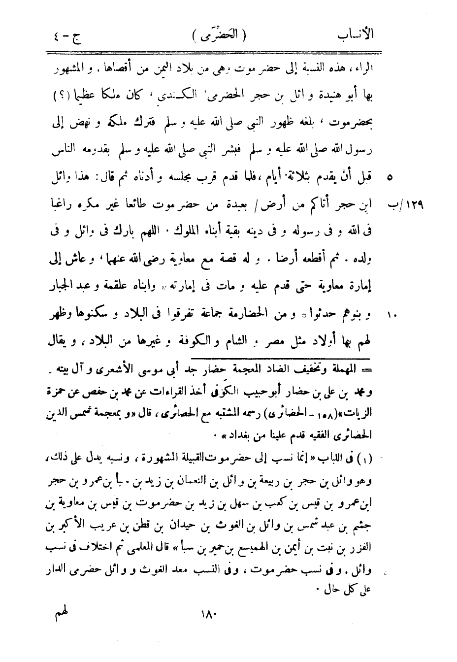 [1] في اللباب «إنما نسب إلى حضرموت القبيلة المشهورة، ونسبه يدل على ذلك، وهو وائل بن حجر بن ربيعة بن وائل بن النعمان بن زيد بن سبإ بن عمرو بن حجر ابن عمرو بن قيس بن كعب بن سهل بن زيد بن حضرموت بن قيس بن معاوية بن جشم بن عبد شمس بن وائل بن الغوث بن حيدان بن قطن بن عريب الأكبر بن الفزر بن بنت بن أيمن بن الهميسع بن حمير بن سبإ» قال المعلمي ثم اختلاف في نسب وائل. وفي نسب حضر موت، وفي النسب معد الغوث ووائل حضرمى الدار على كل حال.