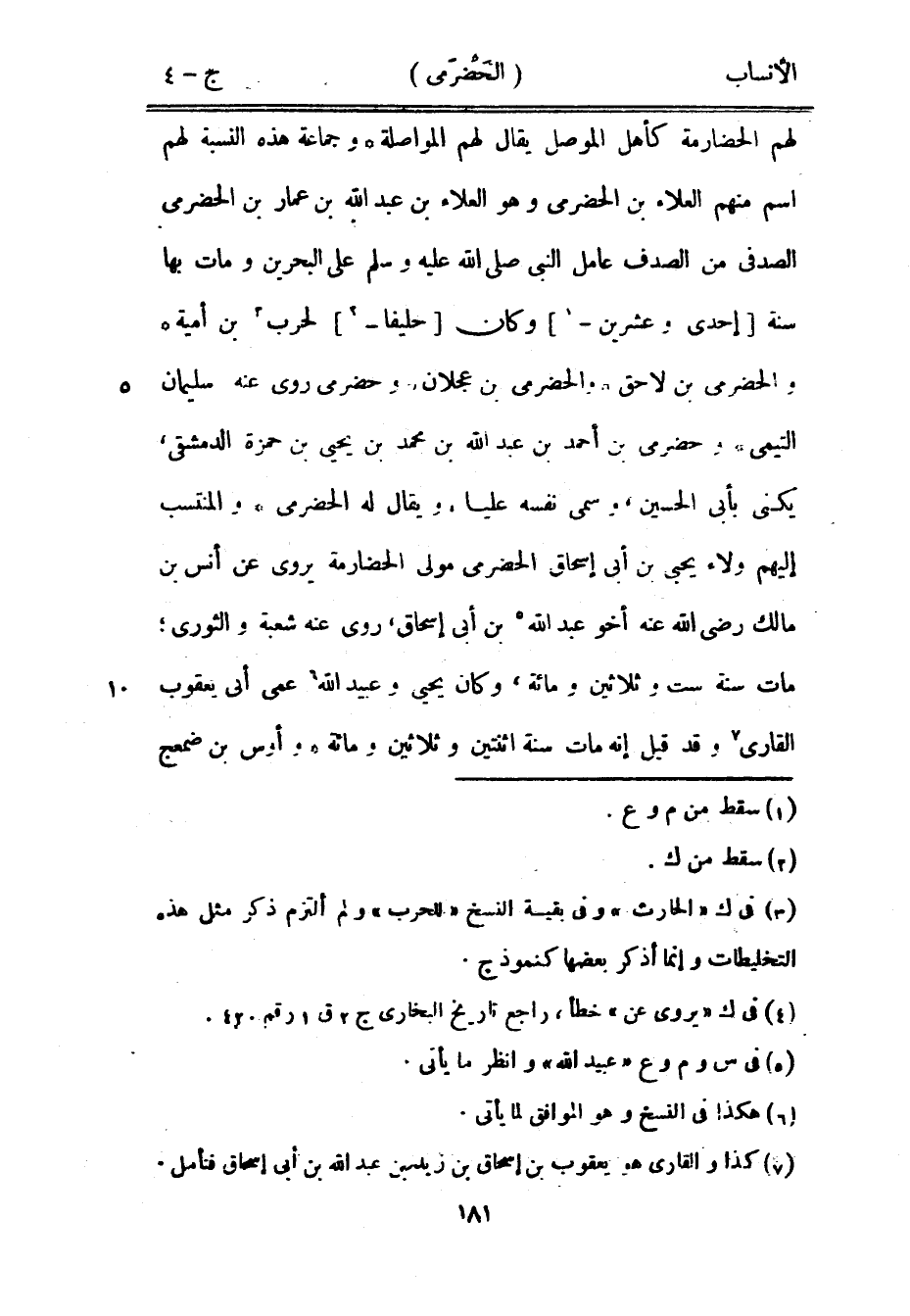 لهم الحضارمة كأهل الموصل يقال لهم المواصلة وجماعة هذه النسبة لهم اسم منهم العلاء بن الحضرميّ وهو العلاء بن عبد الله بن عمار بن الحضرميّ الصدفي من الصدف عامل النبي صلى الله عليه وسلم على البحرين ومات بها سنة [إحدى وعشرين-[1]] وكان [حليفا-[2]] لحرب [3] بن أمية والحضرميّ بن لاحق والحضرميّ بن عجلان وحضرمى روى عنه سليمان التيمي وحضرمى بن أحمد بن عبد الله بن محمد بن يحيى بن حمزة الدمشقيّ، يكنى بأبي الحسين، وسمى نفسه عليا، ويقال له الحضرميّ والمنتسب إليهم ولاء يحيى بن أبى إسحاق الحضرميّ مولى الحضارمة يروى عن أنس بن مالك رضى الله عنه أخو عبد الله [4] [5] بن أبى إسحاق، روى عنه شعبة والثوري، مات سنة ست وثلاثين ومائة، وكان يحيى وعبيد الله [6] عمى أبى يعقوب القاري [7] وقد قيل إنه مات سنة اثنتين وثلاثين ومائة وأوس بن ضمعج