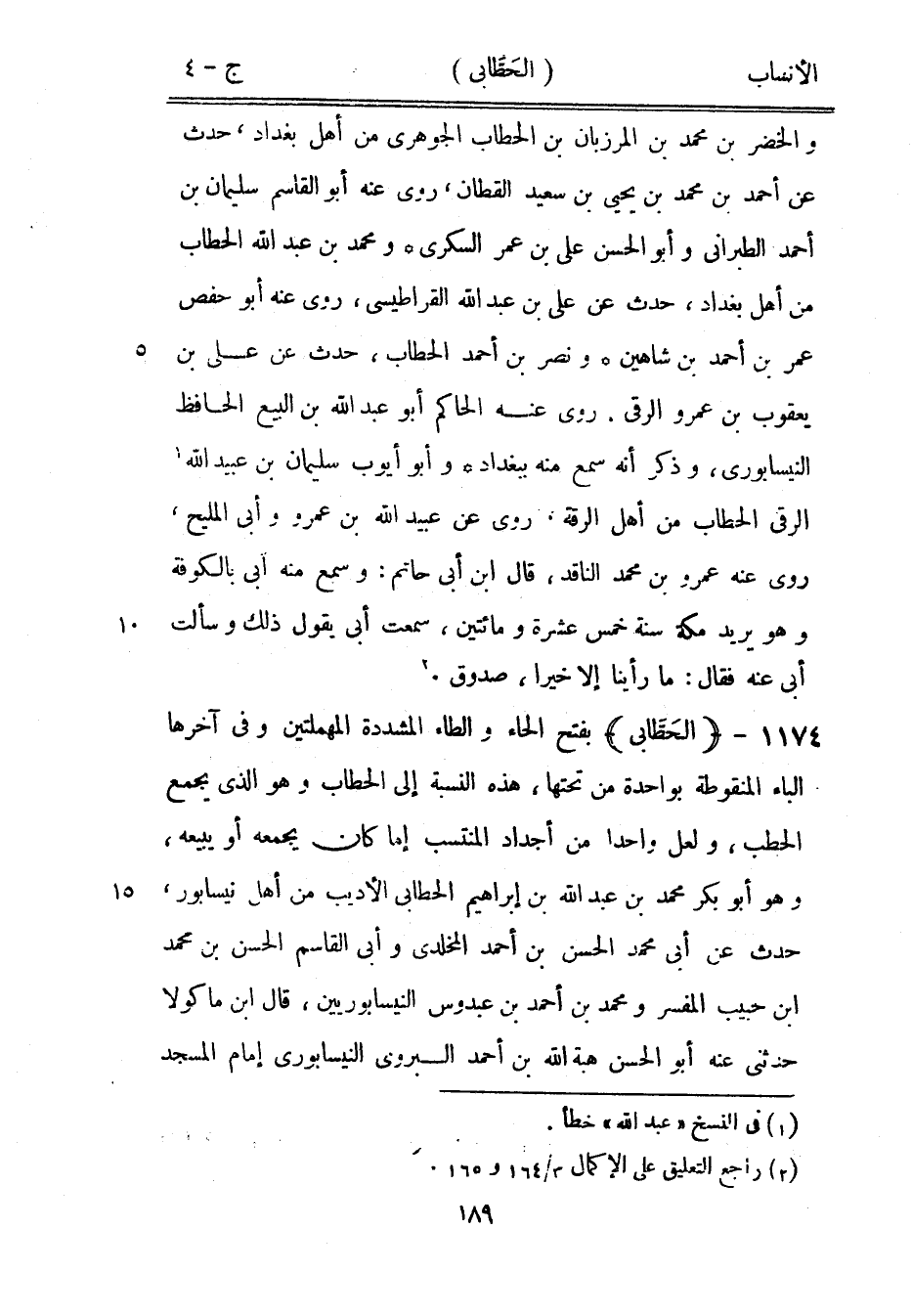 بفتح الحاء والطاء المشددة المهملتين وفي آخرها الباء المنقوطة بواحدة من تحتها، هذه النسبة إلى الحطاب وهو الّذي يجمع الحطب، ولعل واحدا من أجداد المنتسب إما كان يجمعه أو يبيعه، وهو أبو بكر محمد بن عبد الله بن إبراهيم الحطابى الأديب من أهل نيسابور، حدث عن أبى محمد الحسن بن أحمد المخلدي وأبى القاسم الحسن بن محمد ابن حبيب المفسر ومحمد بن أحمد بن عبدوس النيسابوريين، قال ابن ماكولا حدثني عنه أبو الحسن هبة الله بن أحمد البروي النيسابورىّ إمام المسجد